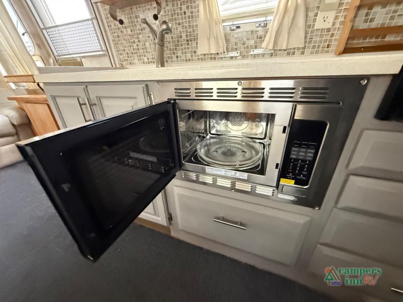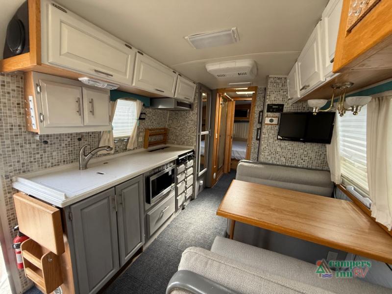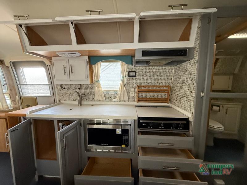 Appliances: 3-burner cooktop with oven, refrigerator, microwave-ready space, and a roof-mounted air conditioner