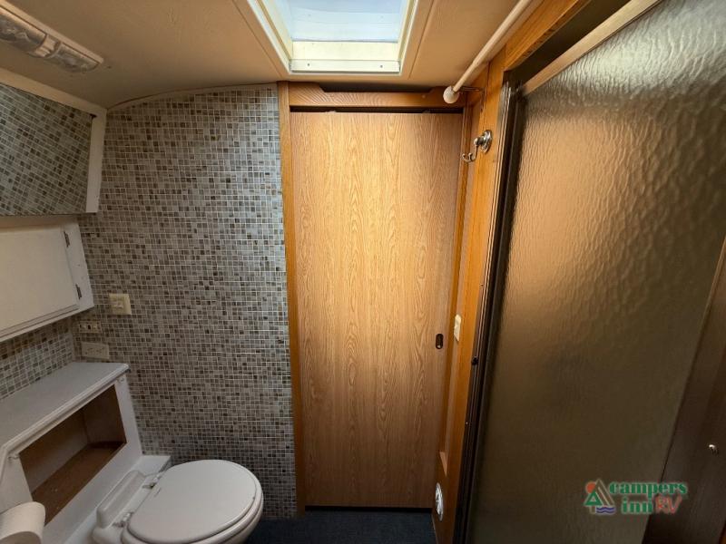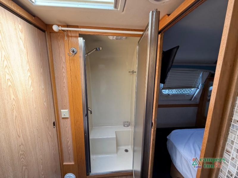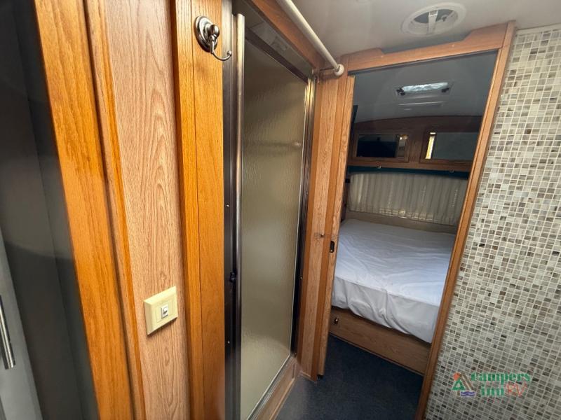 Layout: Front queen bed, central living area, rear bathroom with a split shower layout