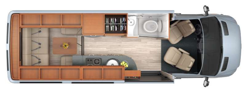 In the rear enjoy a sofa that stretches the entire width of the unit providing ample storage above, and along both the road and curb side too. There is also a dining table with bench seats that along with the sofa can seat four for a meal. You can convert it into a spacious and comfortable 68" x 74" queen size bed when it is time to sleep.