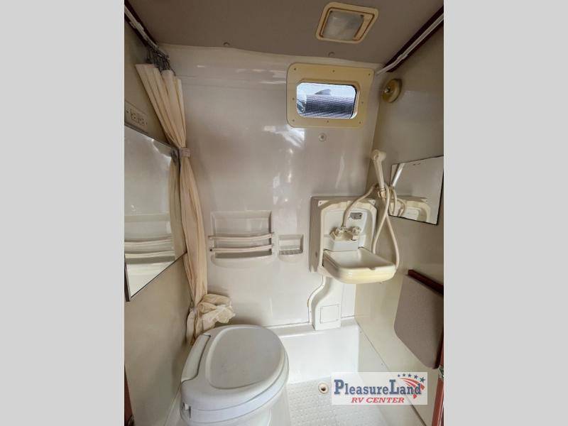 Once inside you will see how it will be very easy to enjoy any adventure you find yourself on. The driver and passenger seats swivel to the rear of the coach for convenience. Just beyond the driver's seat you will find another travel convenience, a wet bath. Inside find a shower, toilet, and vanity with mirror. A wardrobe for your hanging clothes is next, and then the refrigerator follows along the road side wall as you head to the rear of the coach.