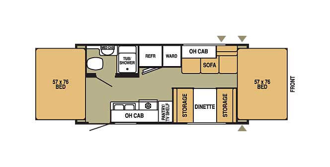 Expandable w/Rear Queen Tent End Bed, Tub/Shower, Medicine Cabinet, Double Kitchen Sink, 3 Burner Cooktop, Wardrobe, Pantry/TV Shelf, Booth Dinette, Sofa, Overhead Storage, Storage Below Dinette, Front Queen Tent End Bed, Outside Storage Compartments and More.