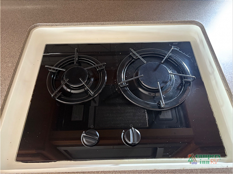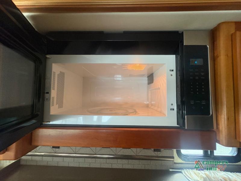 - Three-burner cooktop, convection microwave, and oven offer a variety of cooking options.