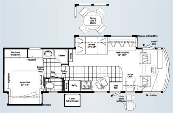 Double Slide, Rear Queen Bed Slideout w/Nightstands, Wardrobe w/Drawers & TV Cabinet, Lav., Angle Shower, Stool Room, Pantry Refrigerator, 3 Burner Range, Double Kitchen Sink, Lounge Chair, Rest Easy Sofa/Booth Dinette Slideout, Pantry, Overhead Cabinets, Choice of Chassis, and Much More!