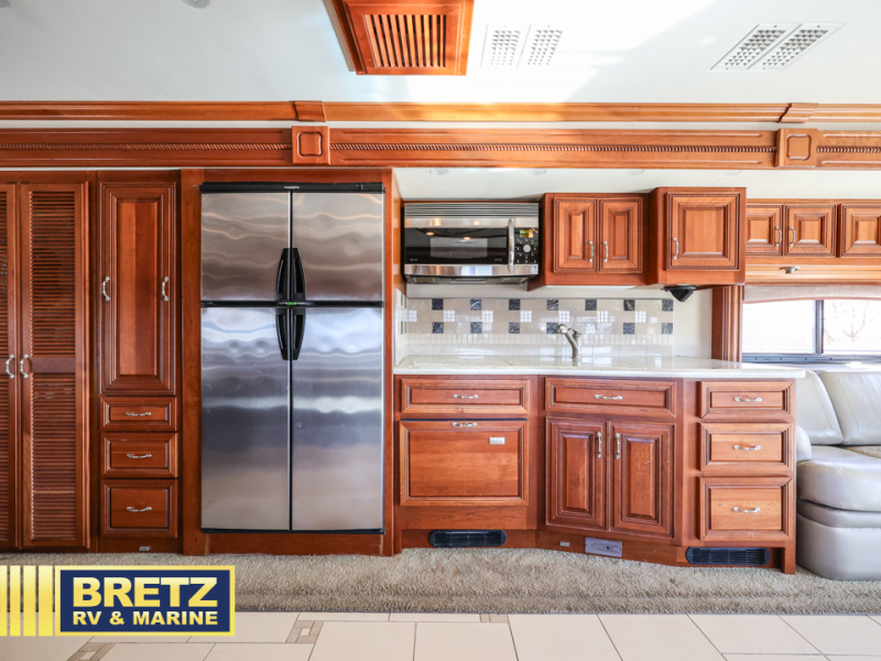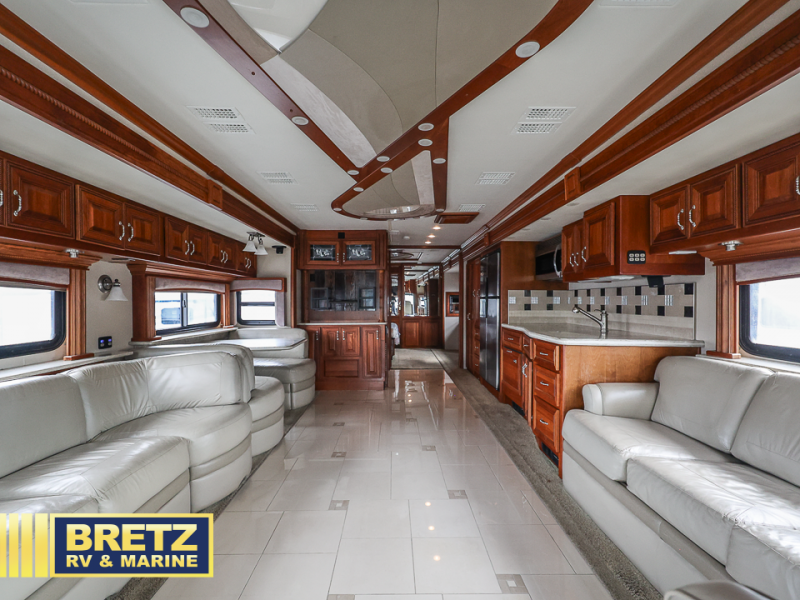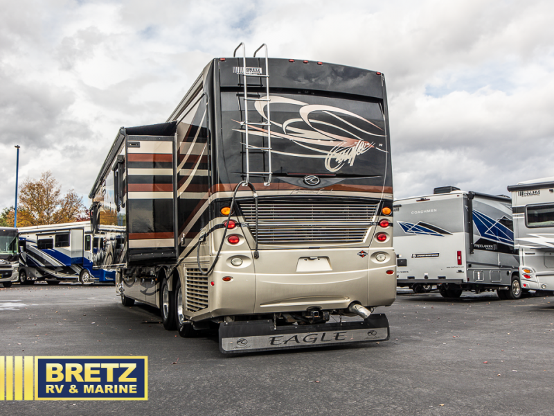 American Eagle Class A Diesel Coach by American Coach w/Triple Slide Outs & 1-1/2 Baths, Full Wall Slide on Drivers Side Includes Sofa Bed/Dbl. Kitchen Sink/2 Burner Cooktop w/Micro./4 Door Refrig./Pantry/Washer/Dryer, Bedroom Desk w/Overhead & 26" Flat Panel TV, Rear Full Bath w/Large Wardrobe, Toilet & Sink & Shower w/Seat, Queen Bed Slide w/Nightstands, 1/2 Bath, 40" Flat Panel TV in Living Area, Dining Table w/Base Cab. & Sofa Slide, 32" Flat TV Above Cab & More! 500 Hp Eng. Opt.