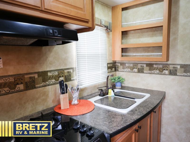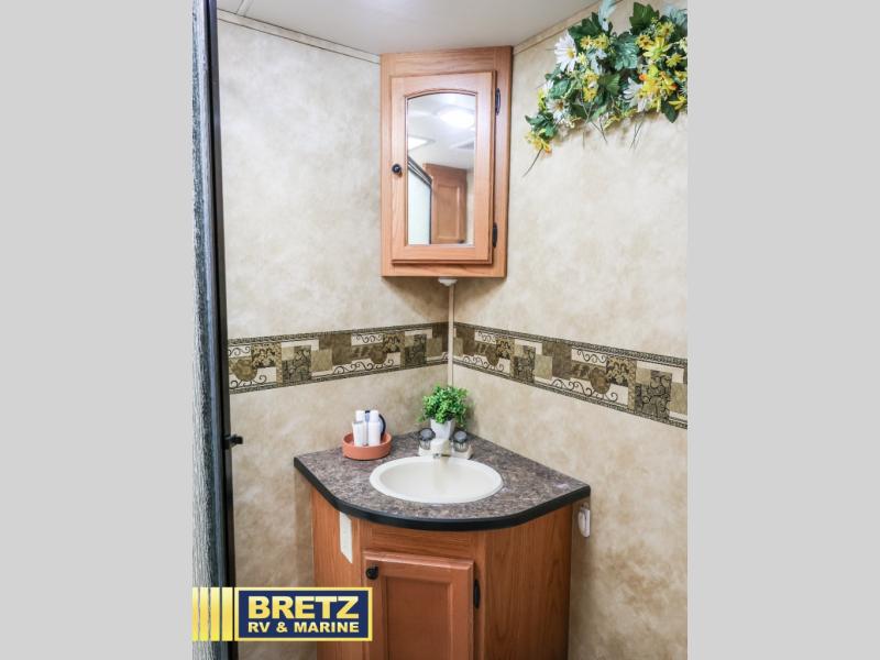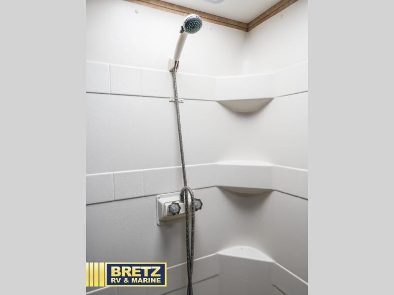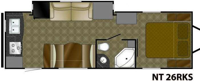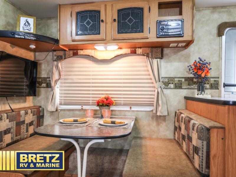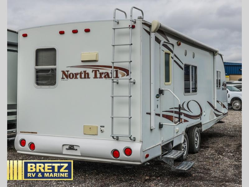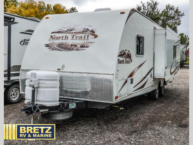 Single Slide North Trail Trailer w/Rear Kitchen w/Pantry, 3 Burner Range, Overhead Cabinet, Double Kitchen Sink, Refrigerator/Jack-Knife Sofa & Wardrobe Slideout, Booth Dinette w/Overhead Storage, Linen Cabinet, Neo-Angle Shower, Lav., 2nd Wardrobe, Front Queen Bed w/Storage Below, Nightstands w/Shirt Closets Above and Much More!