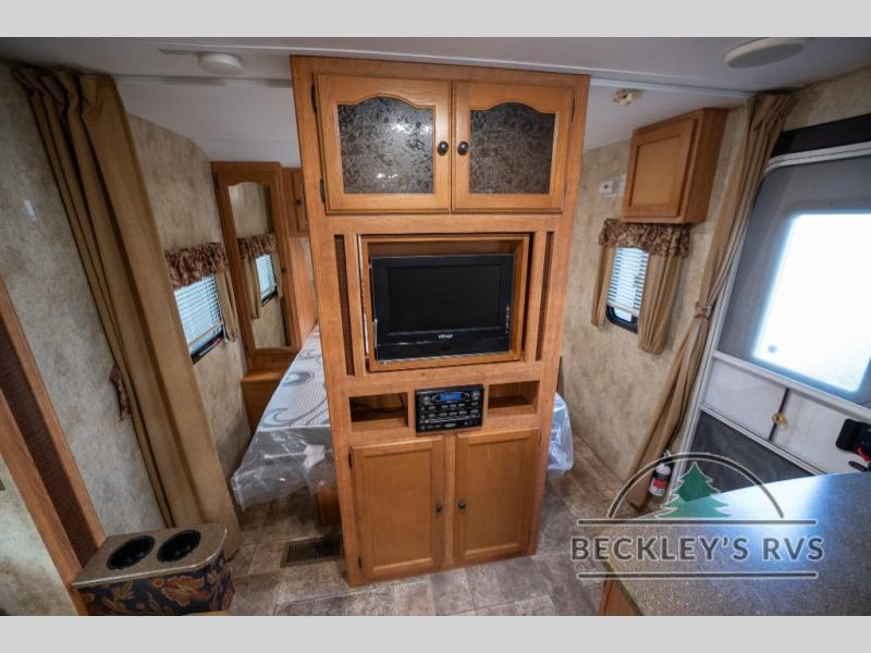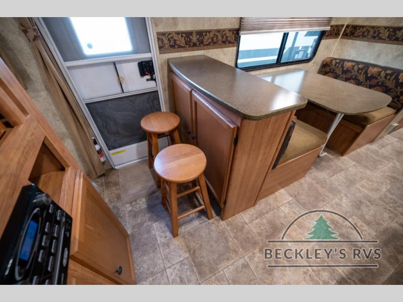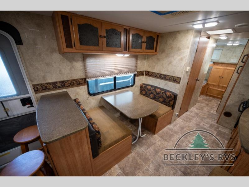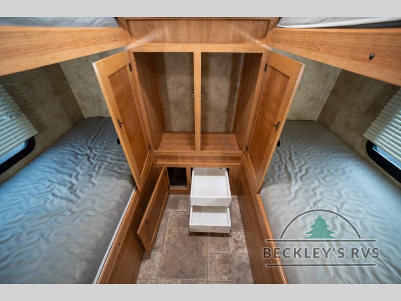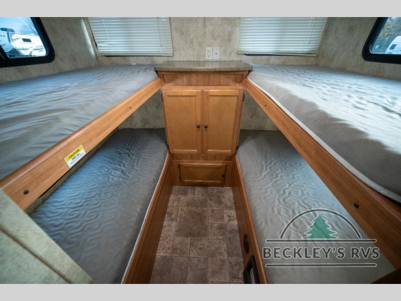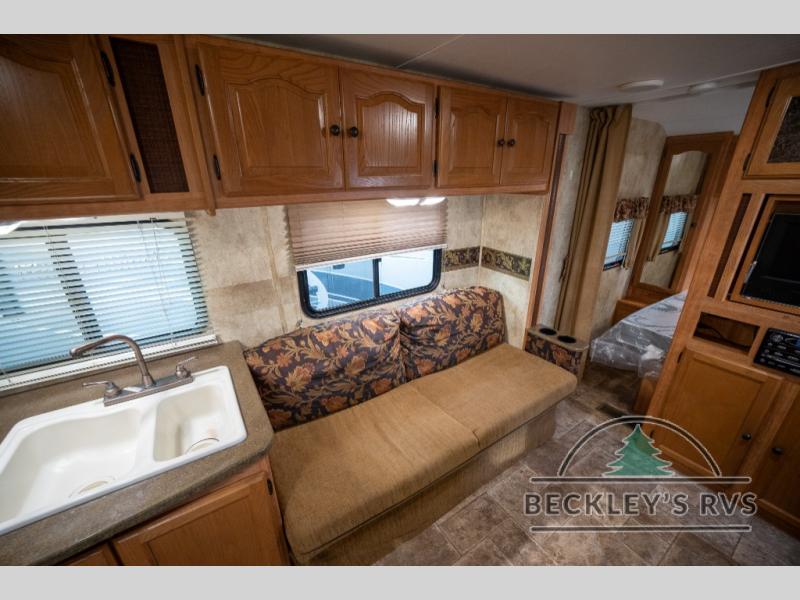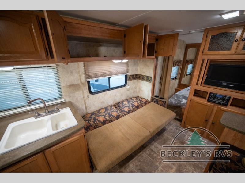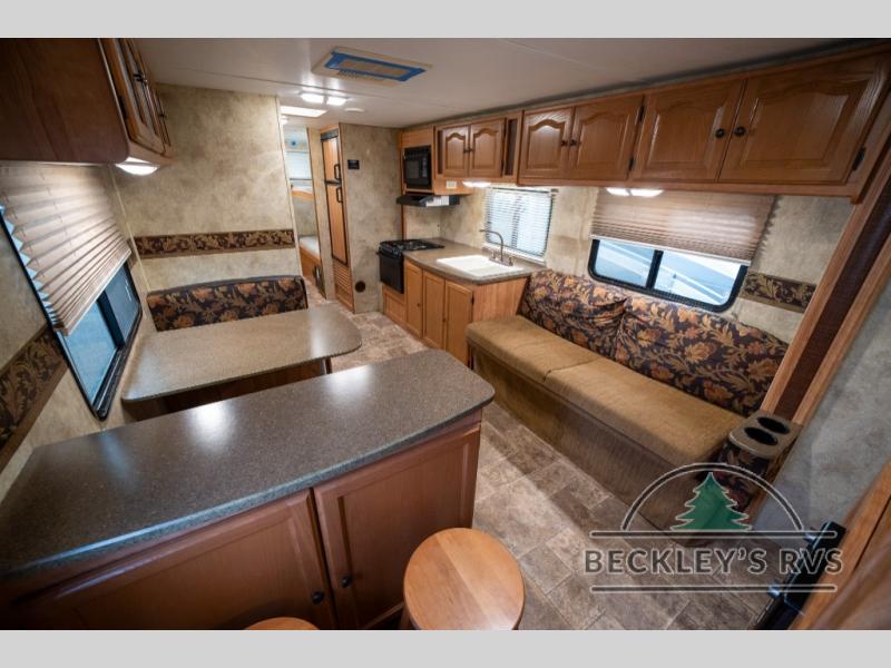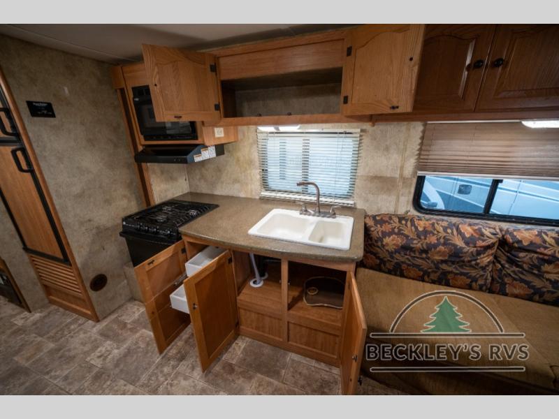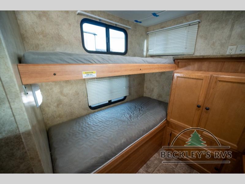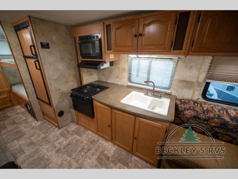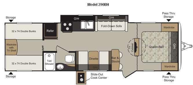 Single Slide Travel Trailer, Rear Bunkhouse w/Quad Bunks, Wardrobe w/TV Shelf Between, Tub/Shower, Toilet, Sink, Booth Dinette, Bar & Stools, Swivel TV, Slideout 3 Burner Range/Double Kitchen Sink & Fold-Down Sofa, Front Queen Bed, Wardrobe, Pass-Thru Storage, Exterior Slide-Out Cook Center and More.