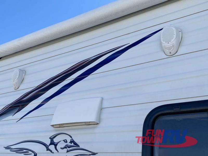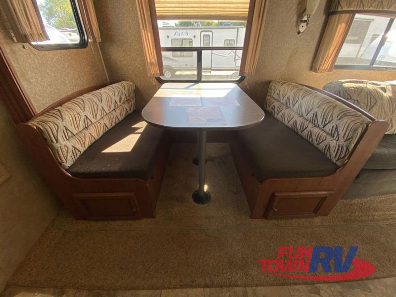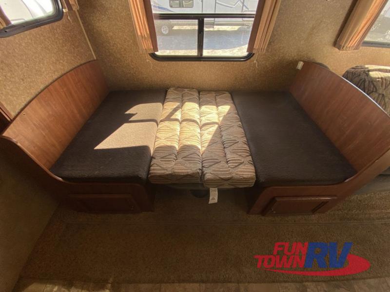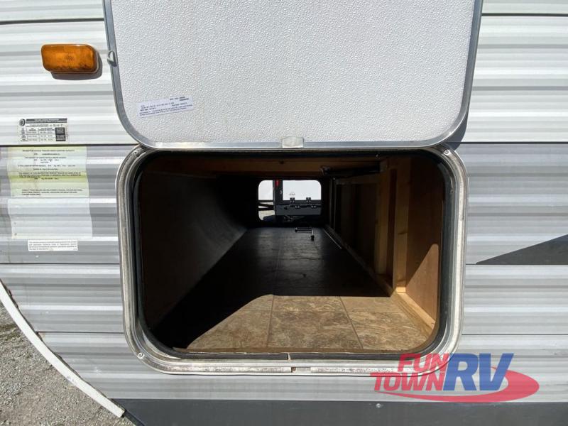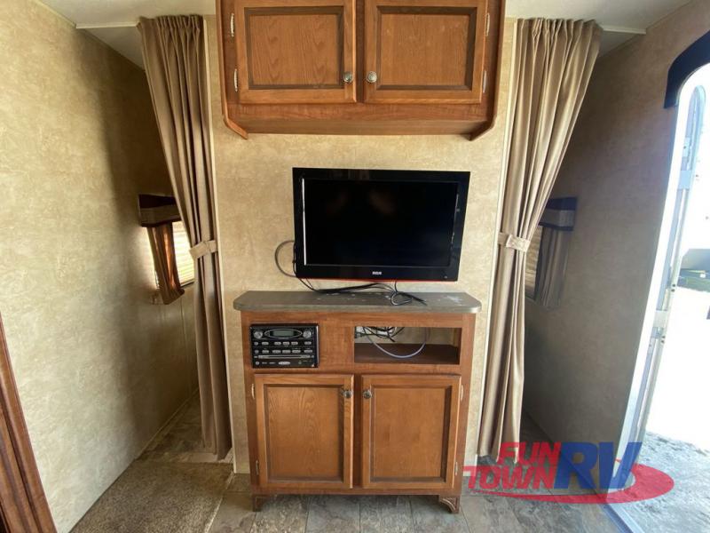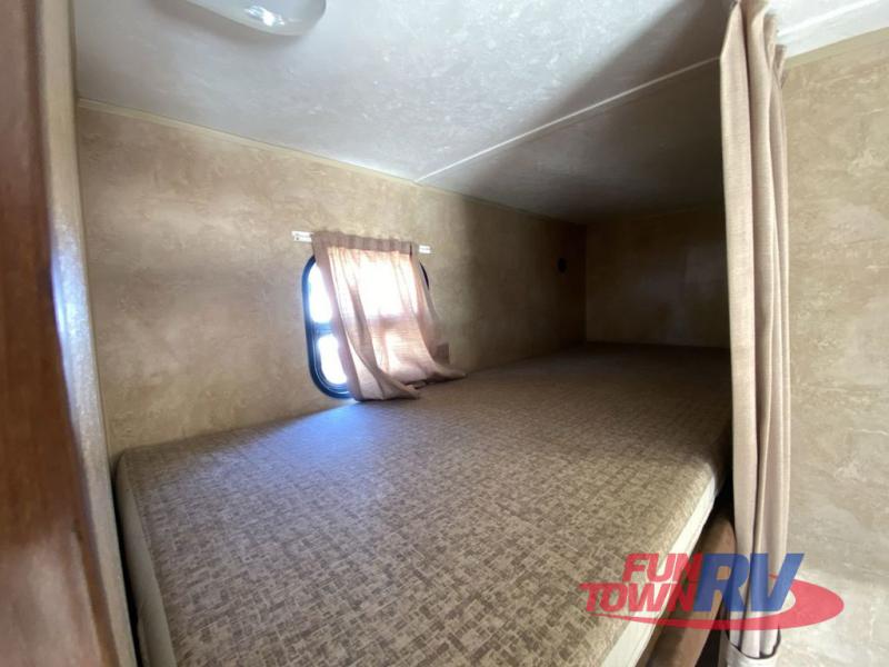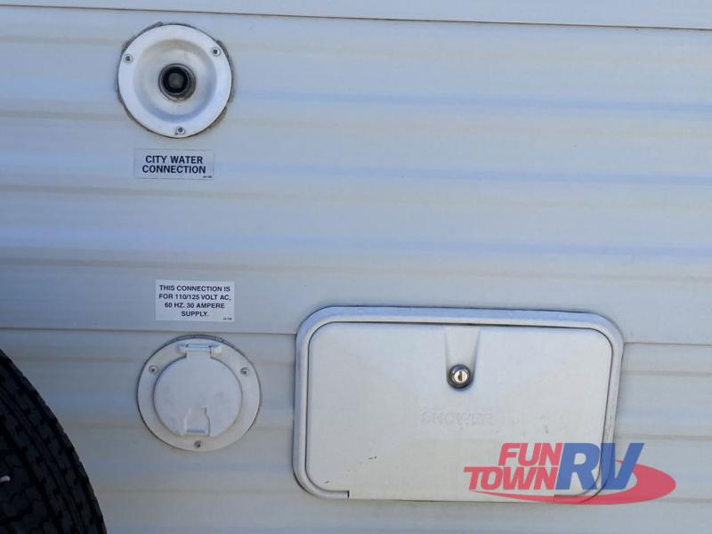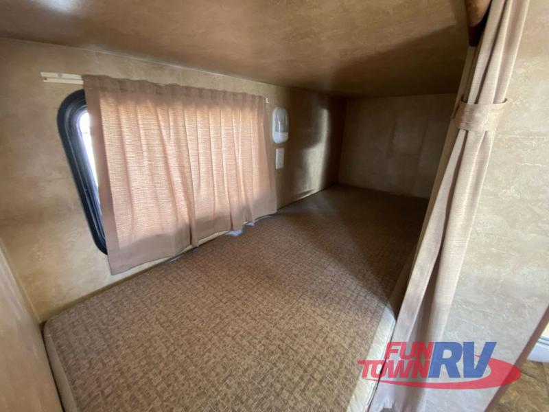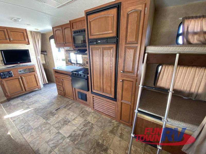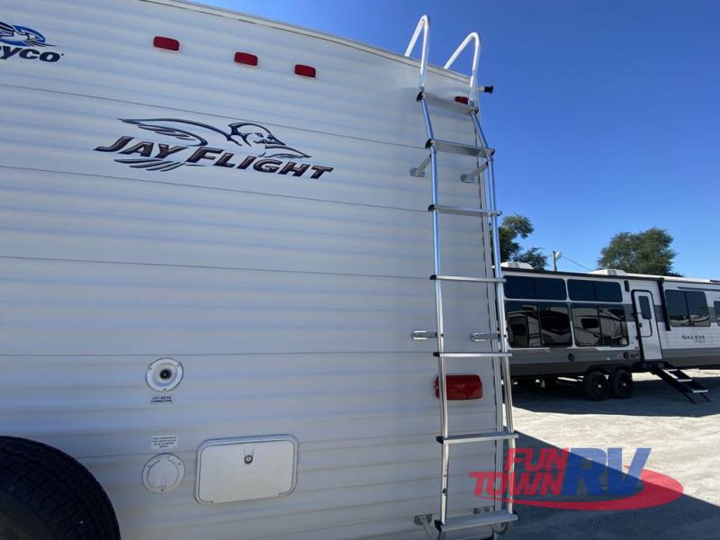 Single Slide Jay Flight, Rear Bathroom, Tub/Shower, Lav, Med. Cab., Toilet, Bunk Beds, Pantry, Refrigerator, Microwave, 3 Burner Range, Double Kitchen Sink, Flip Up Shelf, Slideout Booth Dinette/J-Steel Sofa, Ent. Center, Front Bedroom w/Queen Bed, Dbl. Wardrobes, Pass Thru Storage, 16' Awning and More. Available Options May Include: Free-Standing Table & Chairs, Hide-A-Bed.