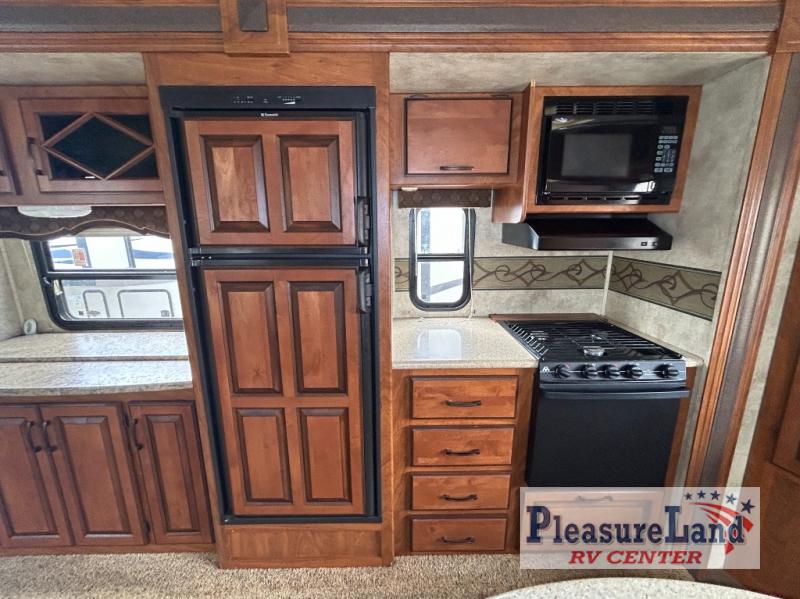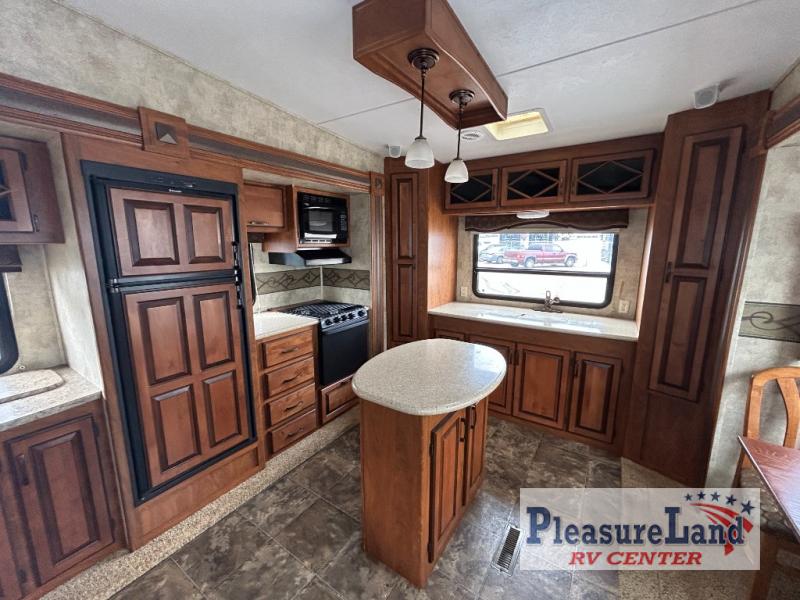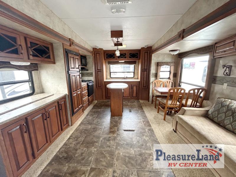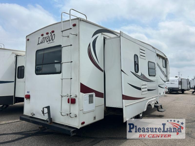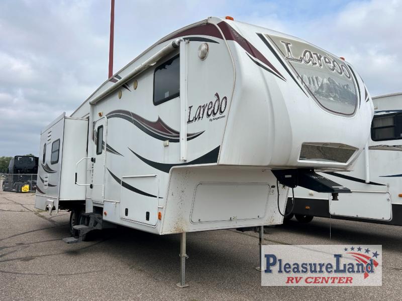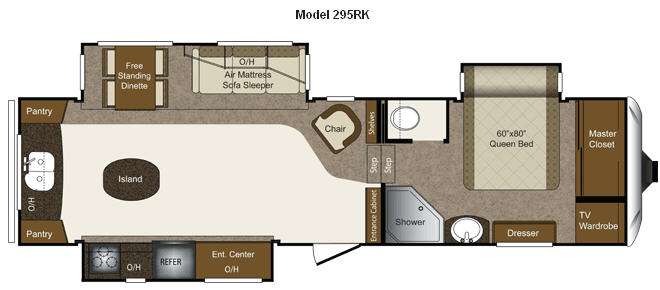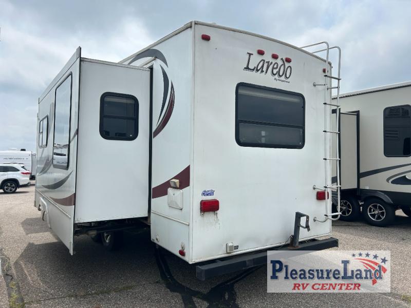Keystone Laredo FW w/Rear Kitchen Including: 2 Pantry's, Dbl. Kitchen Sink, Overhead Storage, Kitchen Island, 3 Burner Range/Refrigerator & Ent. Center w/Overhead Storage Slideout, Free Standing Dinette & Air Mattress Sofa Sleeper Slide, Lounge Chair, Shelves, Ent. Center, Step Up to Bed & Bath w/Private Toilet Area, Angle Shower, Sink, Dresser, TV/Wardrobe, Master Closets w/Sliding Doors & Queen Bed Slide and More!