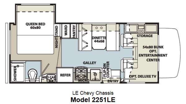 Single Slide Forester LE Motor Home, Rear Queen Bed Slide, Nightstand, Wardrobe, Pantry Dinette, Bunk Above Cab, Flip-On Counter, Single Galley Sink, 3-Burner Range, Microwave, Refrigerator, Med. Cab., Lav., Toilet, Shower, Overhead Cabinets Throughout & Much More. Available Options May Include: Entertainment Center Above Cab, Deluxe TV.