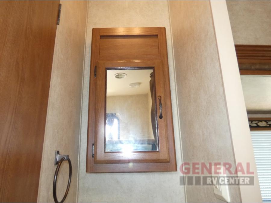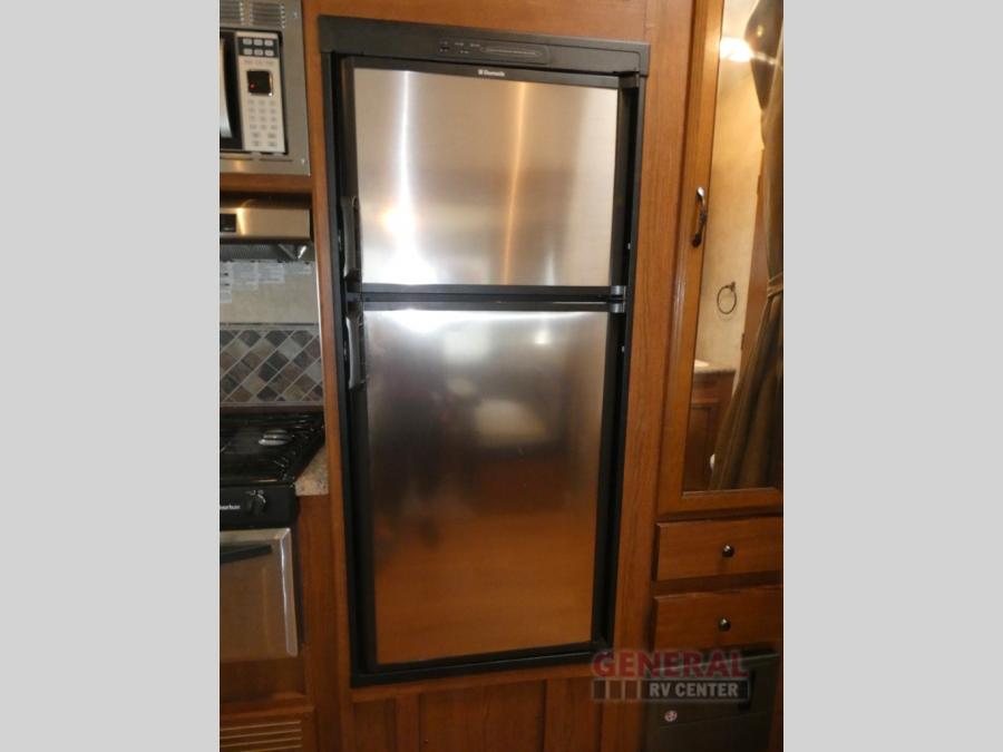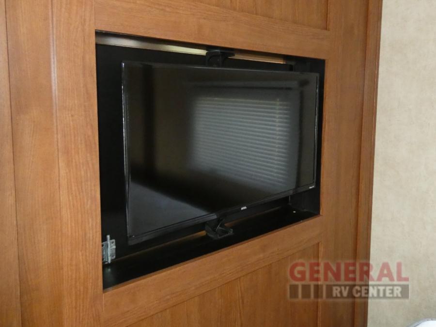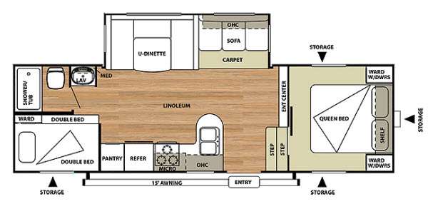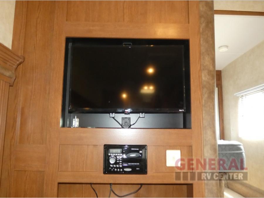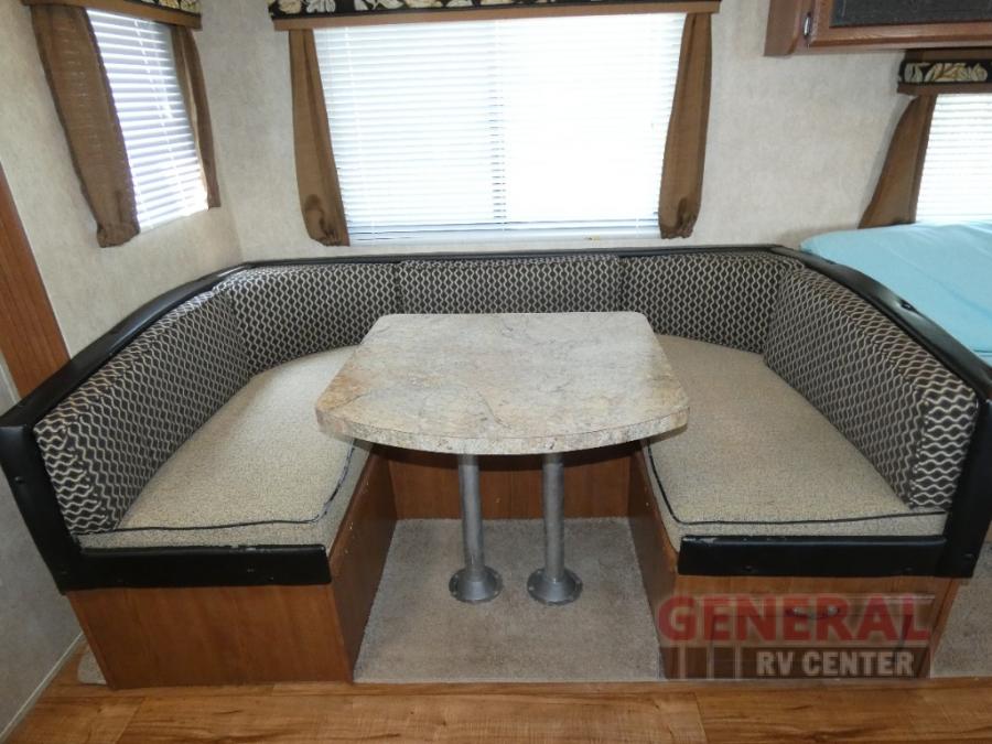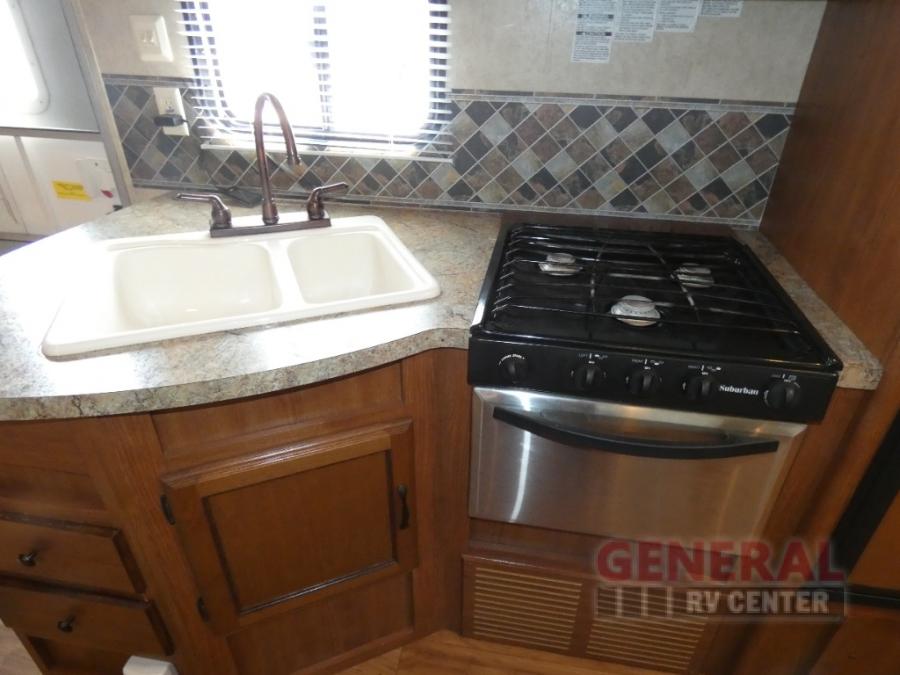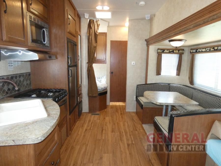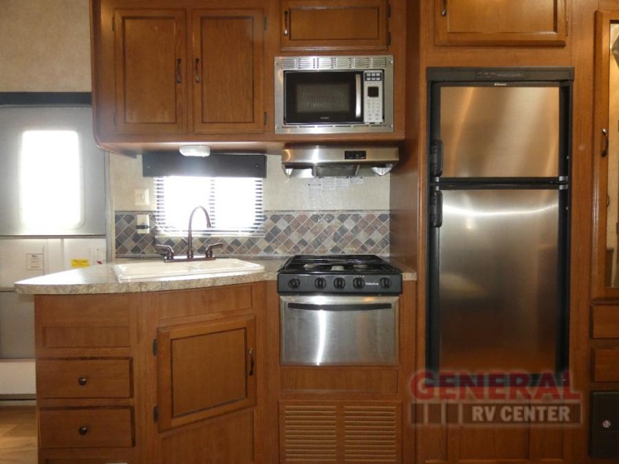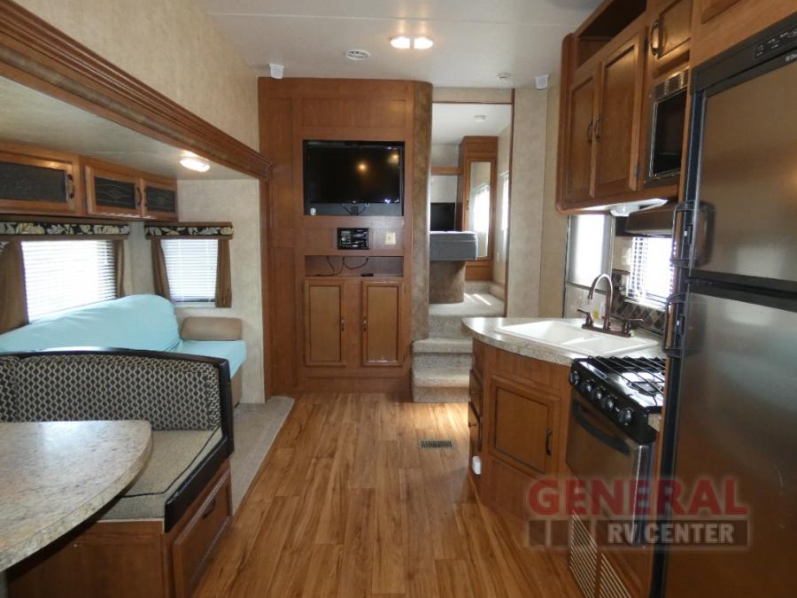 To the left of the entrance you will find a double kitchen sink, three burner range, microwave, refrigerator, and pantry. On the opposite side of the fifth wheel there is a slide with a u-dinette and a sofa. Near the sofa you will find a large entertainment center.