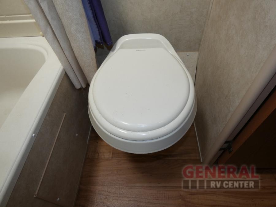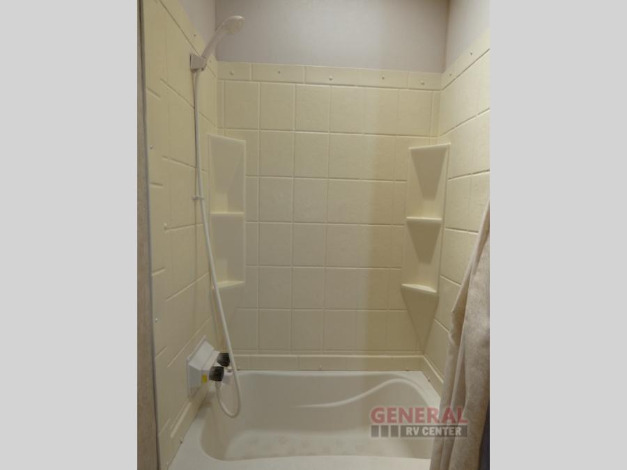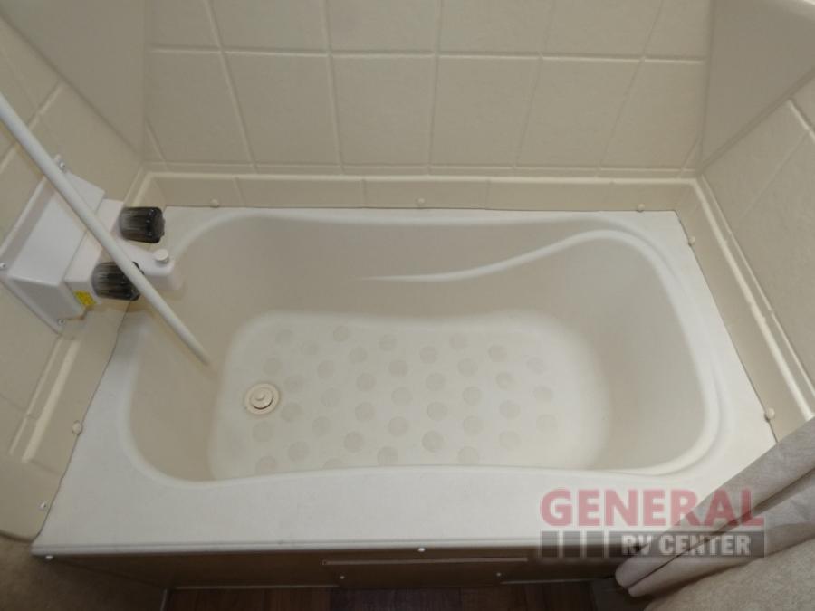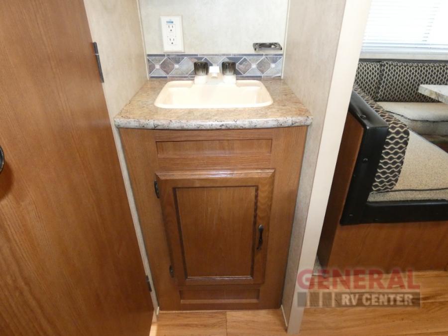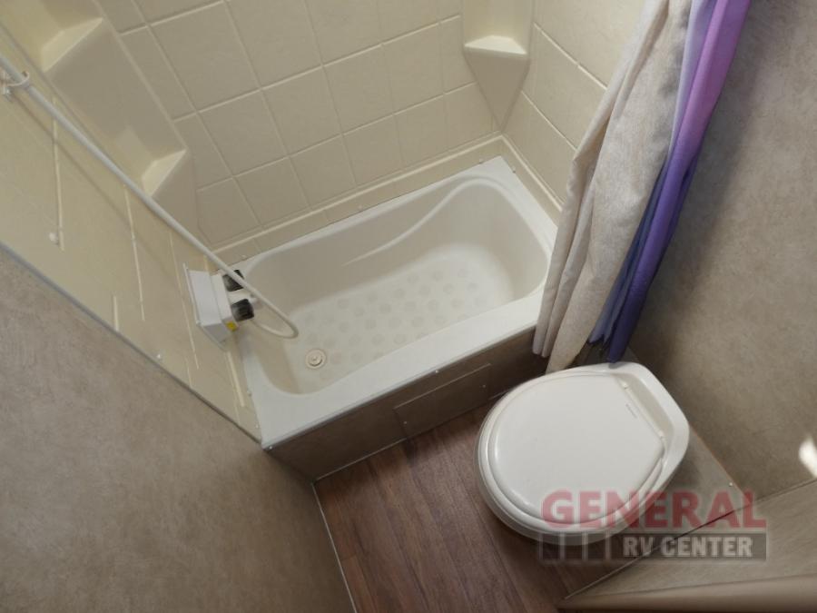 In the rear, you will find the bathroom with a sink, just outside of the bathroom area. Inside the bathroom there is a toilet, and shower/tub.