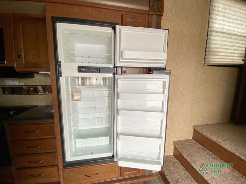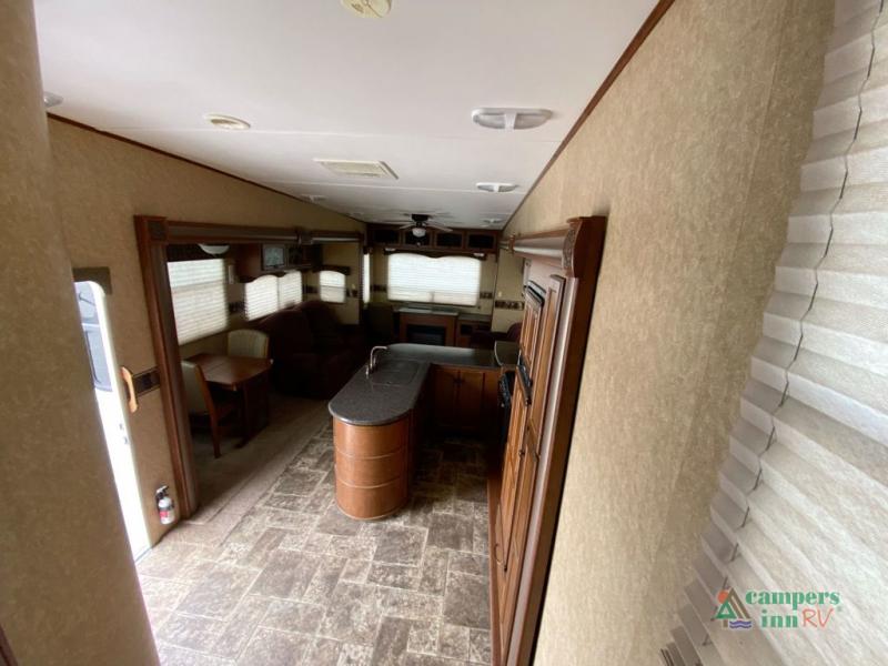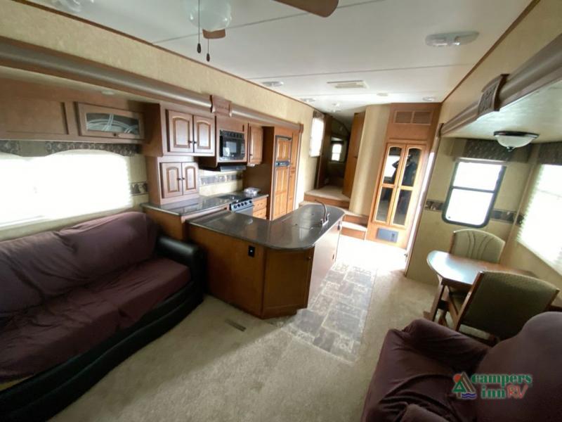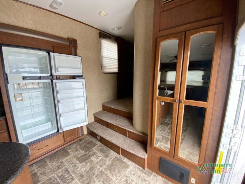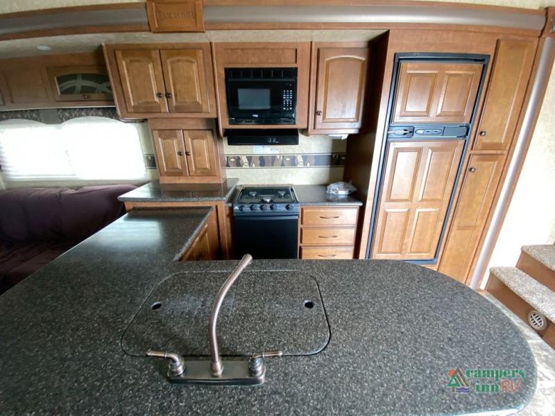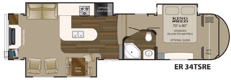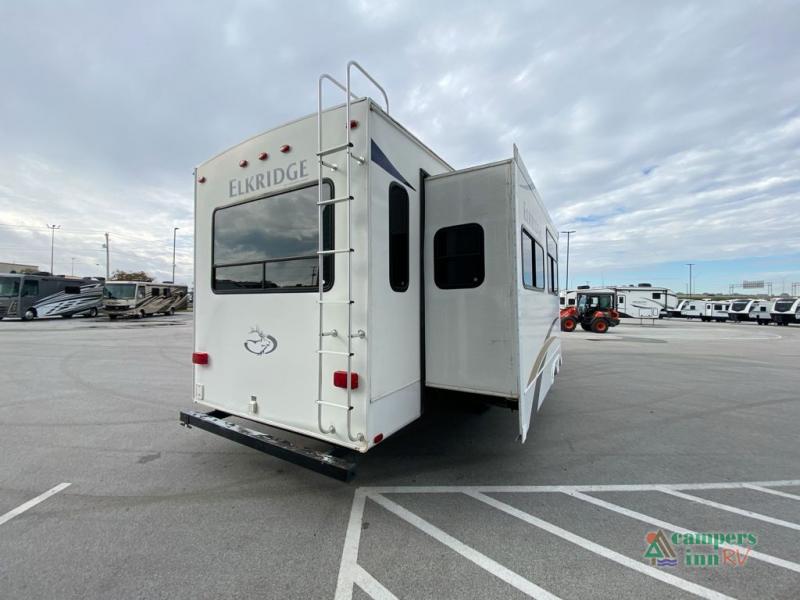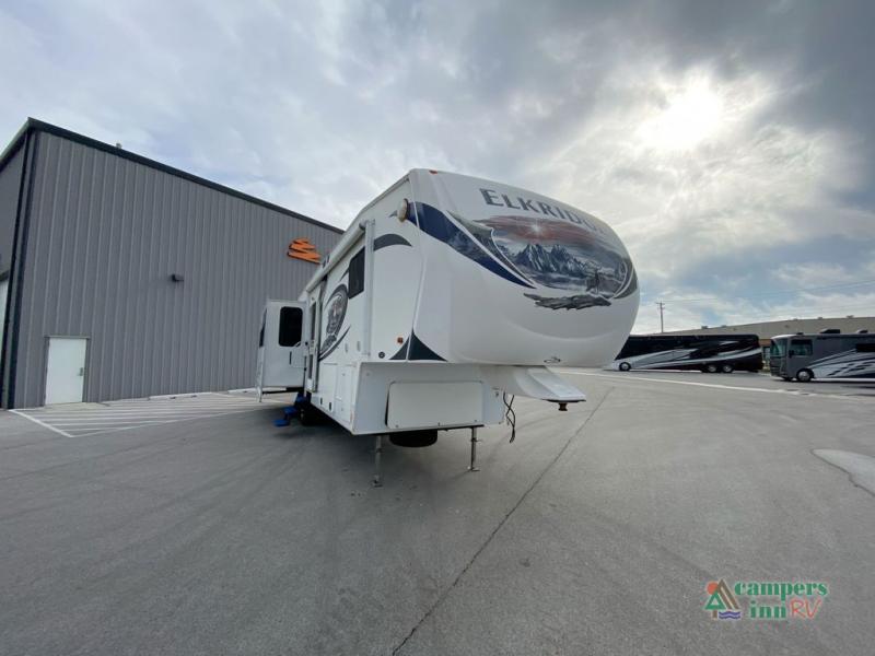 Heartland ElkRidge FW w/Rear Full End Wall Ent. Center w/Desk, Overhead Cabinets, Sofa/L-Shaped Counter w/Dbl. Kitchen Sink/3 Burner Range/Refrigerator & Pantry Slide, 2 Recliner/Gliders & Free Standing Dinette Slide, Step Up to Side Aisle Bath w/Angle Shower, Toilet & Sink, Dbl. Bath Entry, Front King Bed Slide w/Upgraded Pillow-top Mattress & Nightstand, Wardrobe w/Sliding Doors, Dresser, Washer/Dryer Prep, and So Much More! Avail. Options May Include: 4-Door Refrig., Fireplace, Queen Bed.