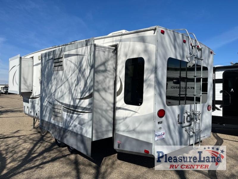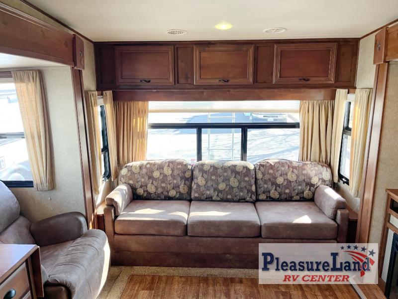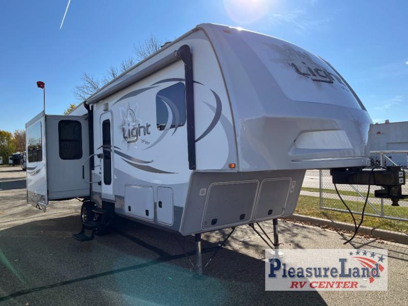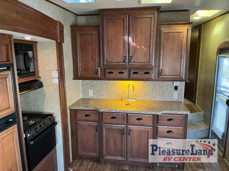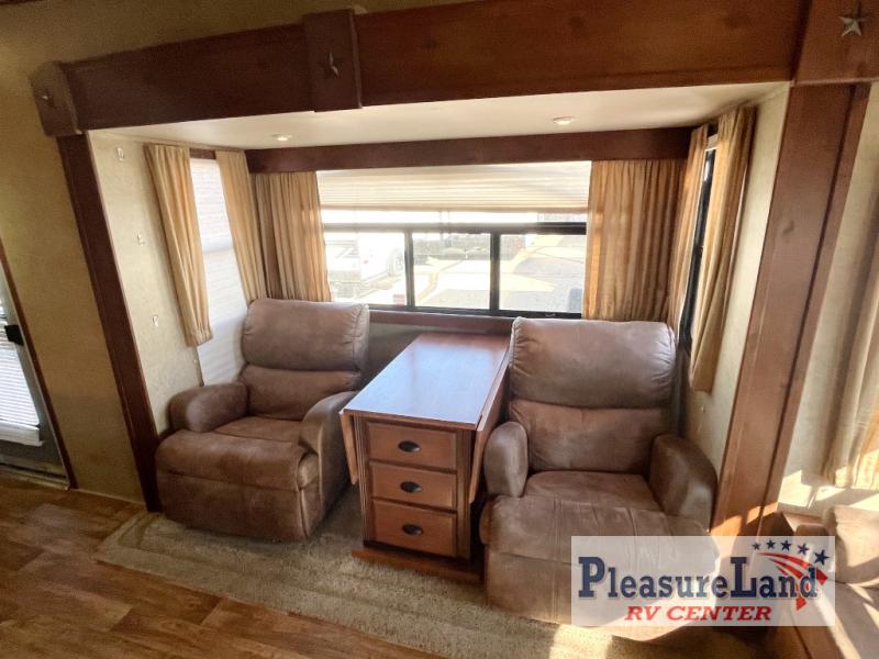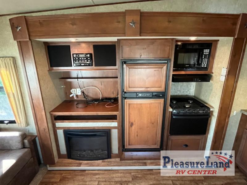 Open Range LIGHT Fifth Wheel w/Rear Sofa w/Overhead Storage, Slideout Area w/2 Chairs & End Table, Slideout Ent. Center w/Fireplace and Desk Top/Refrigerator & 3 Burner Range, Kitchen Island w/4 Backed Bar Height Chairs, Counter w/Overhead Storage & Sink, Step Up to Side Aisle Bath w/Angle Shower, Toilet & Sink & Washer/Dryer Prep/Linen, Front Queen Bed w/Storage Shelves Above & Nightstands Each Side, Slideout Wardrobe w/Mirrored Doors and Much More!