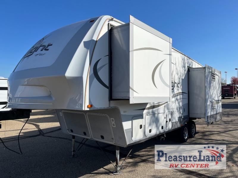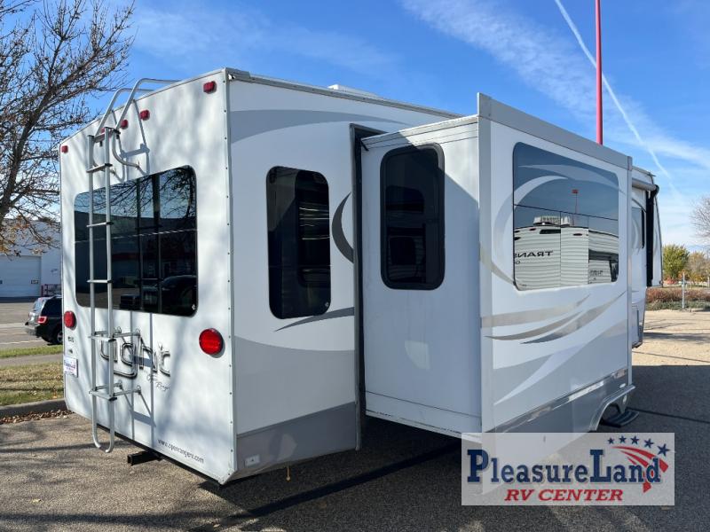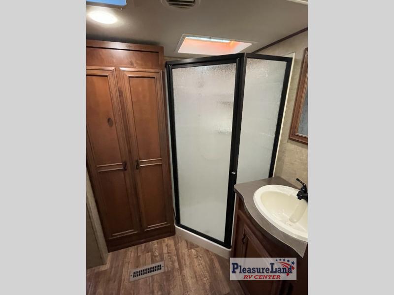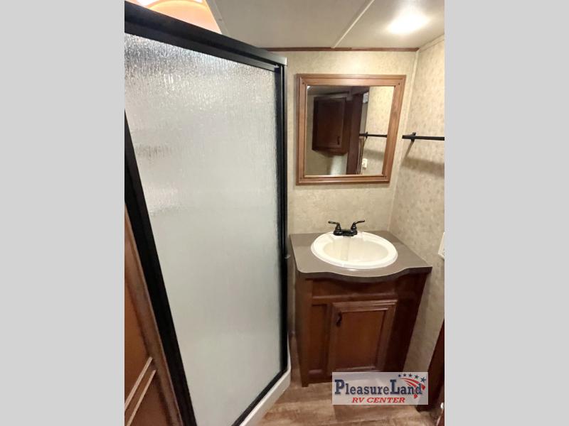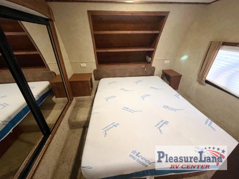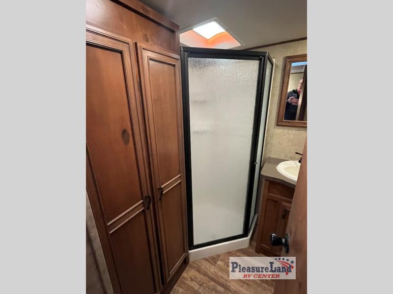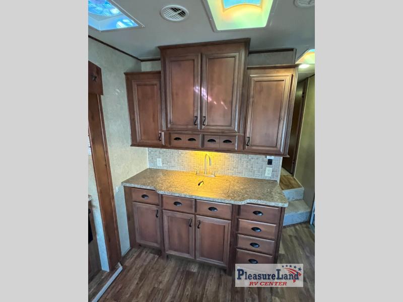 Open Range LIGHT Fifth Wheel w/Rear Sofa w/Overhead Storage, Slideout Area w/2 Chairs & End Table, Slideout Ent. Center w/Fireplace and Desk Top/Refrigerator & 3 Burner Range, Kitchen Island w/4 Backed Bar Height Chairs, Counter w/Overhead Storage & Sink, Step Up to Side Aisle Bath w/Angle Shower, Toilet & Sink & Washer/Dryer Prep/Linen, Front Queen Bed w/Storage Shelves Above & Nightstands Each Side, Slideout Wardrobe w/Mirrored Doors and Much More!