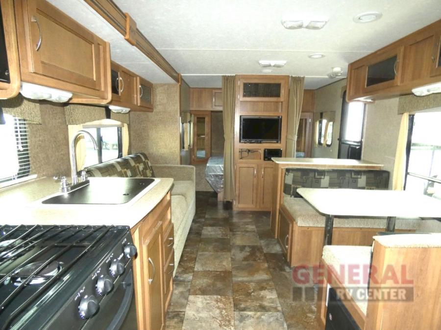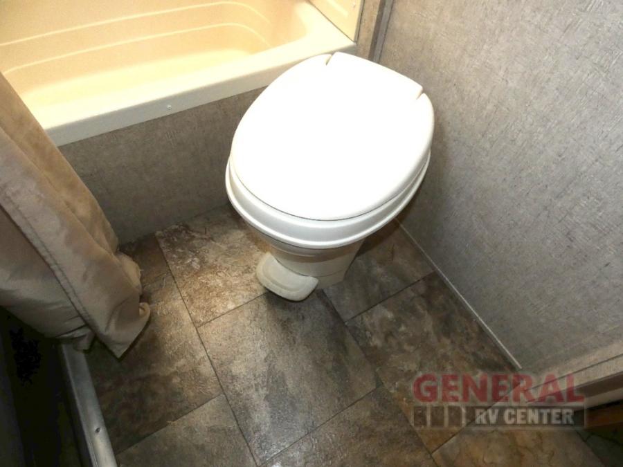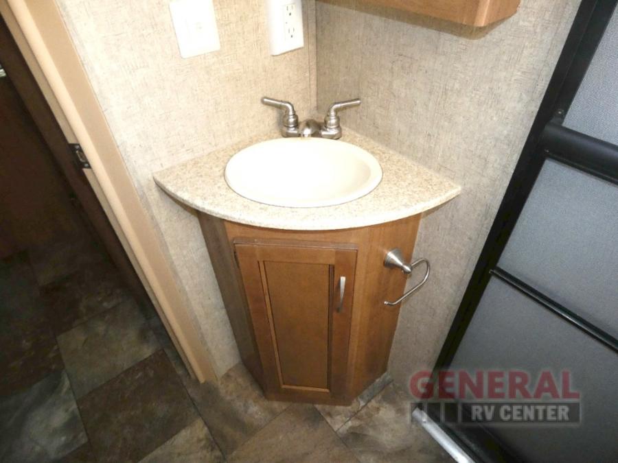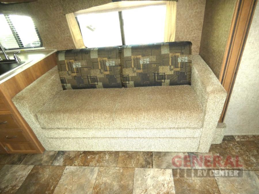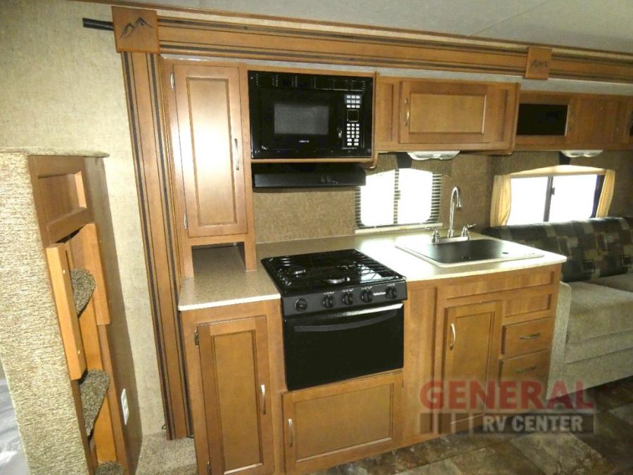 The large slide in the living area opens up the interior and provides a spacious at-home feel. On one side there is a slide-out that includes a sofa, a double kitchen sink, 3 burner range with microwave oven and pantry. Opposite the slide is a booth dinette for meal time, a refrigerator, and a wardrobe just outside the rear corner bath.