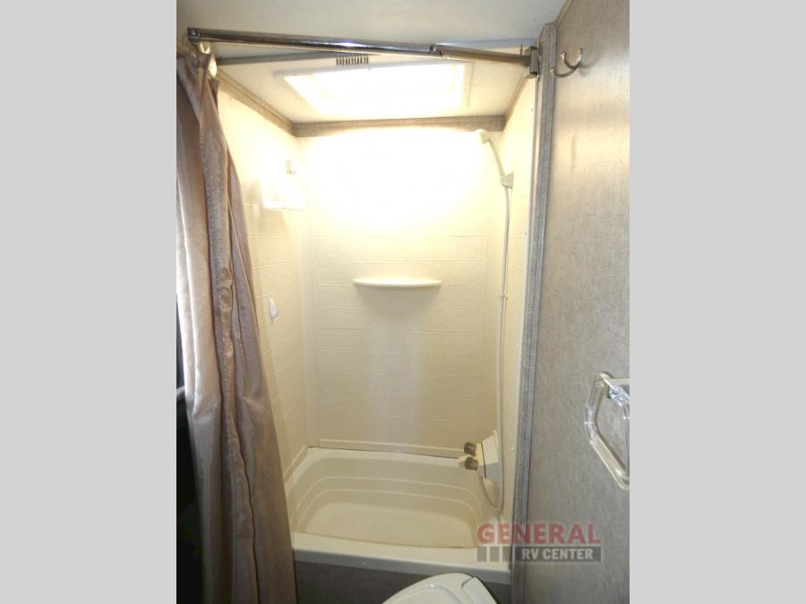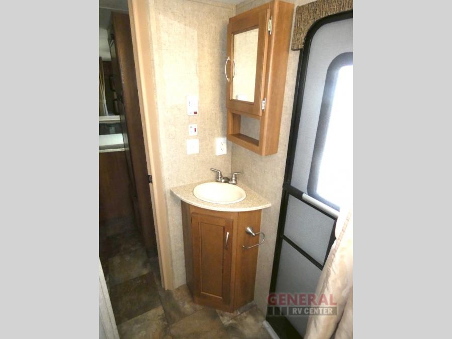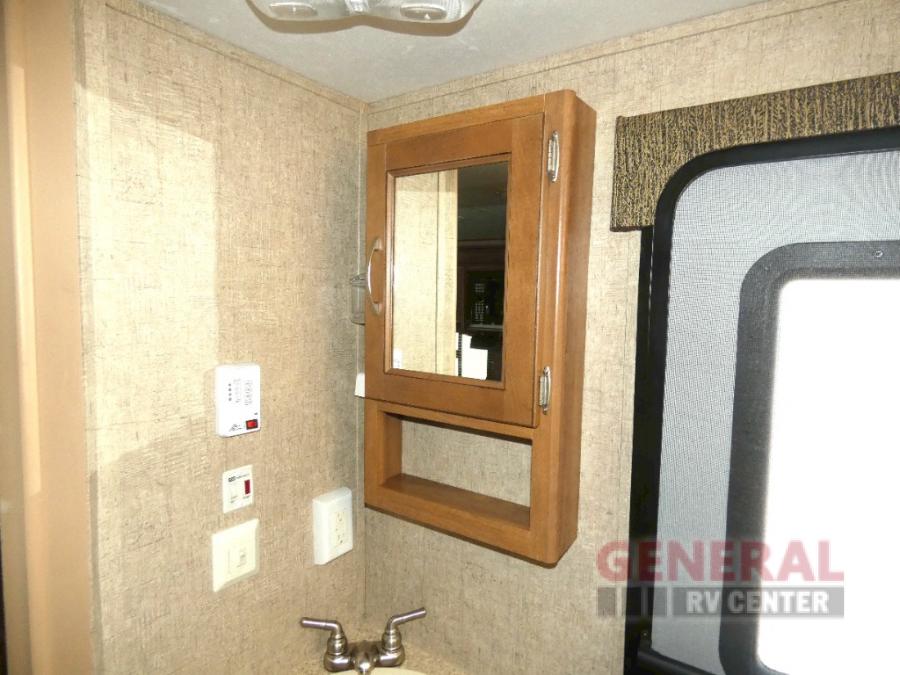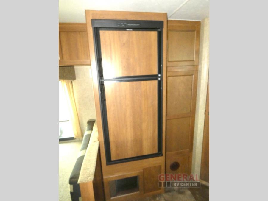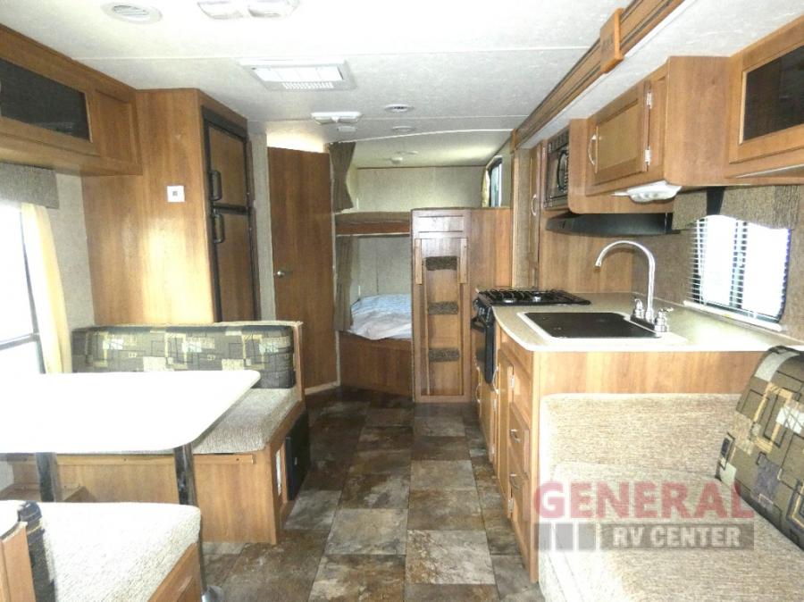 The large slide in the living area opens up the interior and provides a spacious at-home feel. On one side there is a slide-out that includes a sofa, a double kitchen sink, 3 burner range with microwave oven and pantry. Opposite the slide is a booth dinette for meal time, a refrigerator, and a wardrobe just outside the rear corner bath.