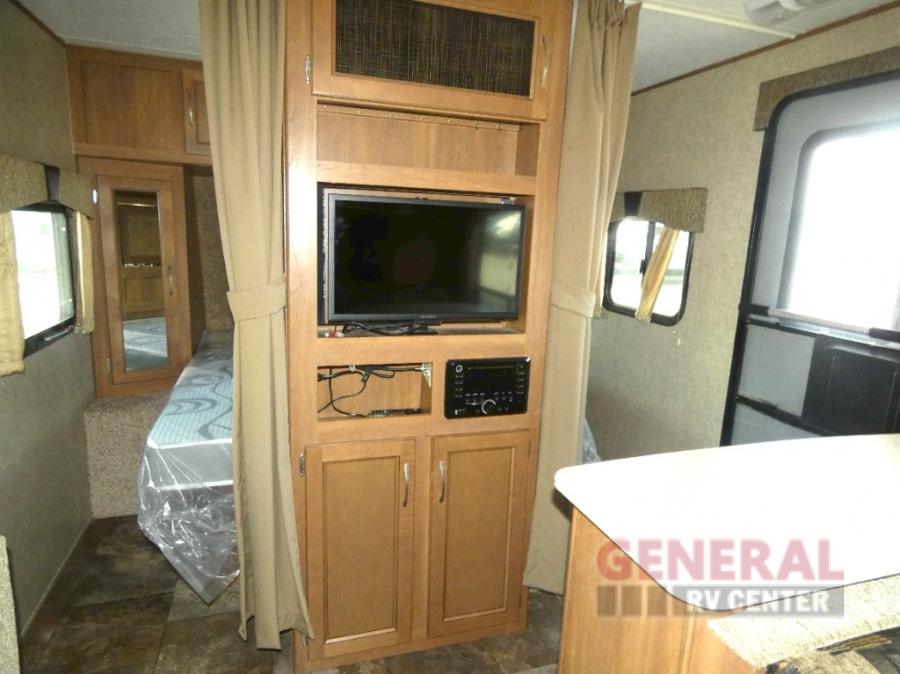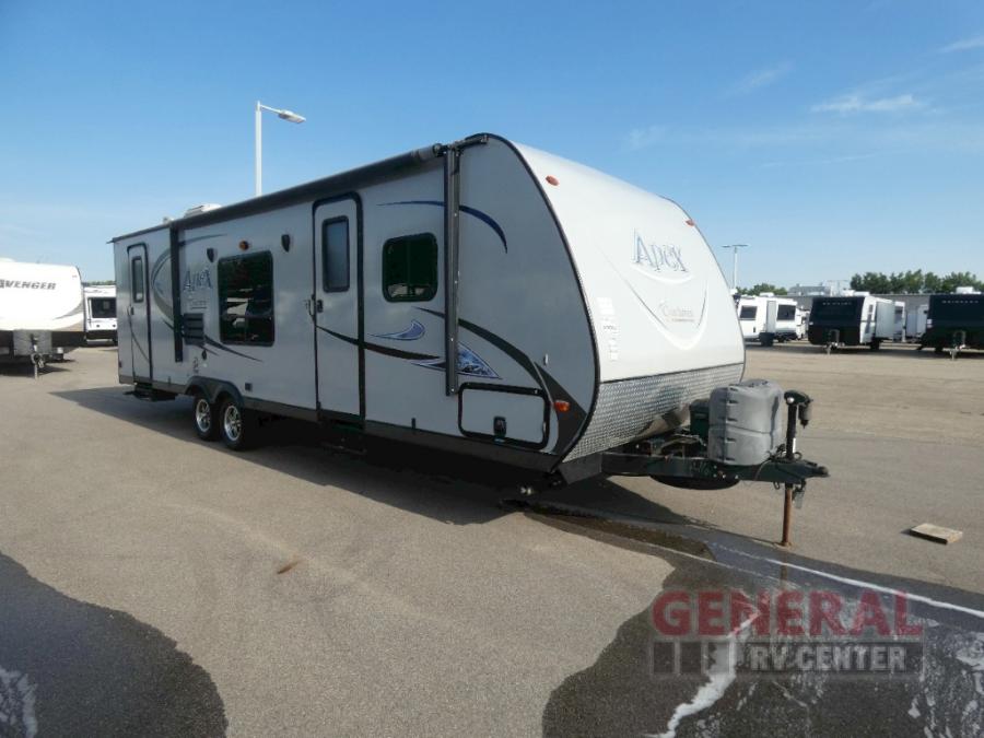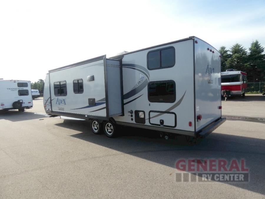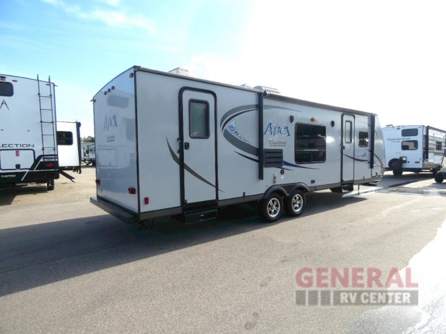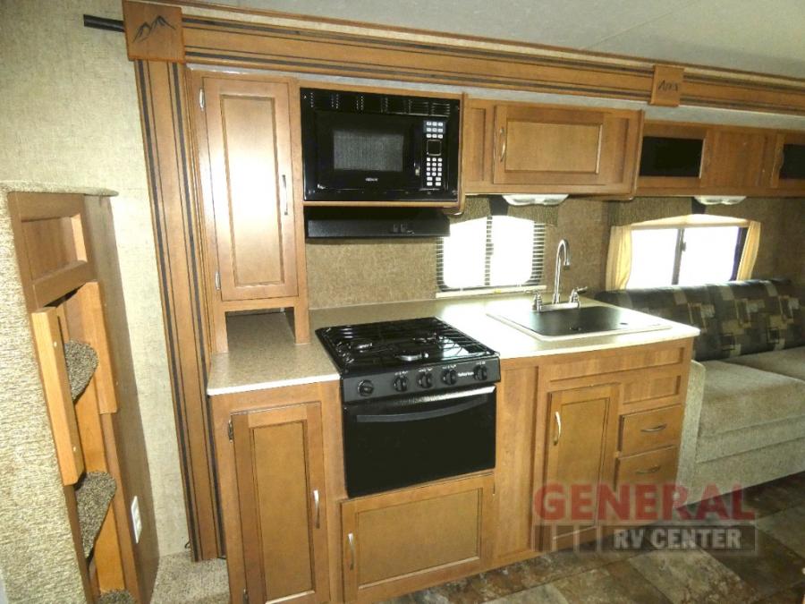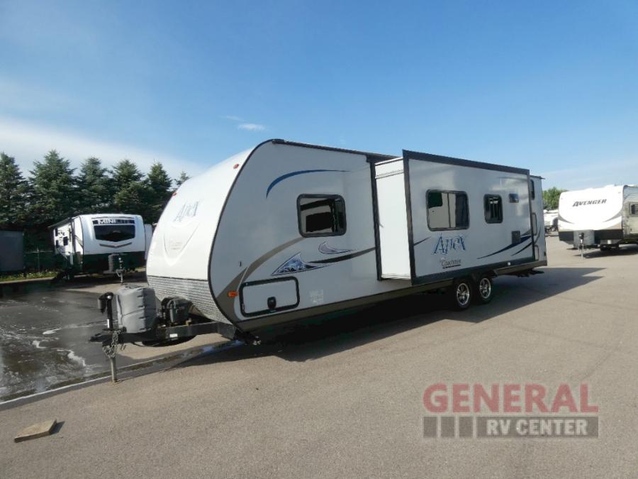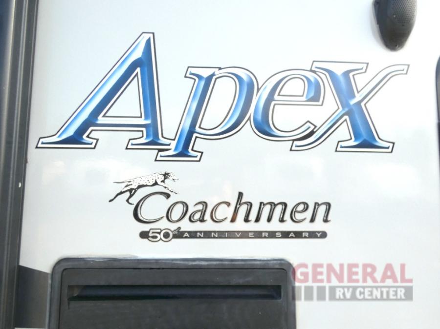 There is no doubt that you will have a great camping experience in this 288BHS Apex ultra lite trailer by Coachmen RV featuring a large slide-out and double bunks. Starting in front as you step inside you will see to your right a queen bed with plenty of storage with wardrobes and overhead cabinets. At the rear of the bed is an entertainment center that can easily be viewed throughout the entire living and kitchen area of the unit.