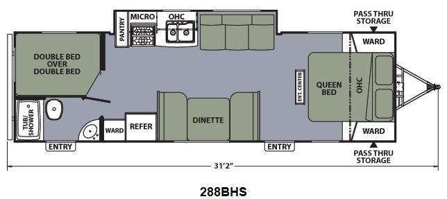 There is also plenty of storage featured throughout the unit with overhead cabinets and wardrobes inside, plus the large pass-thru compartment up front has space for all of your extra gear and much more!