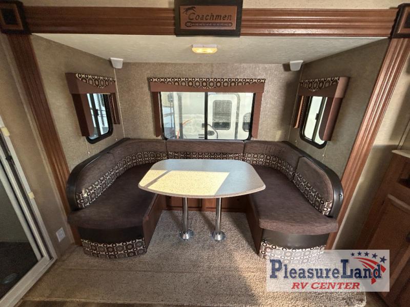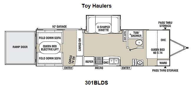 Check out this 301BLDS Freedom Express toy hauler travel trailer by Coachmen RV. It has a rear ramp door for easy loading into a 10' garage space. Inside the cargo area you will find plenty of overhead cabinetry for storage plus a TV overhead cabinet as well. There are two fold down sofas with a removable table between, plus an electric lift queen bed above. There is also a convenient cargo side entry door.
