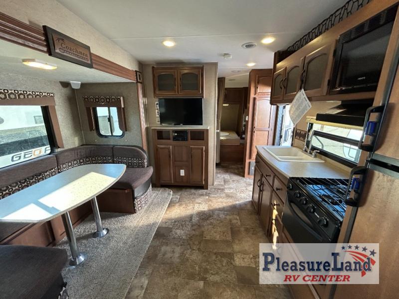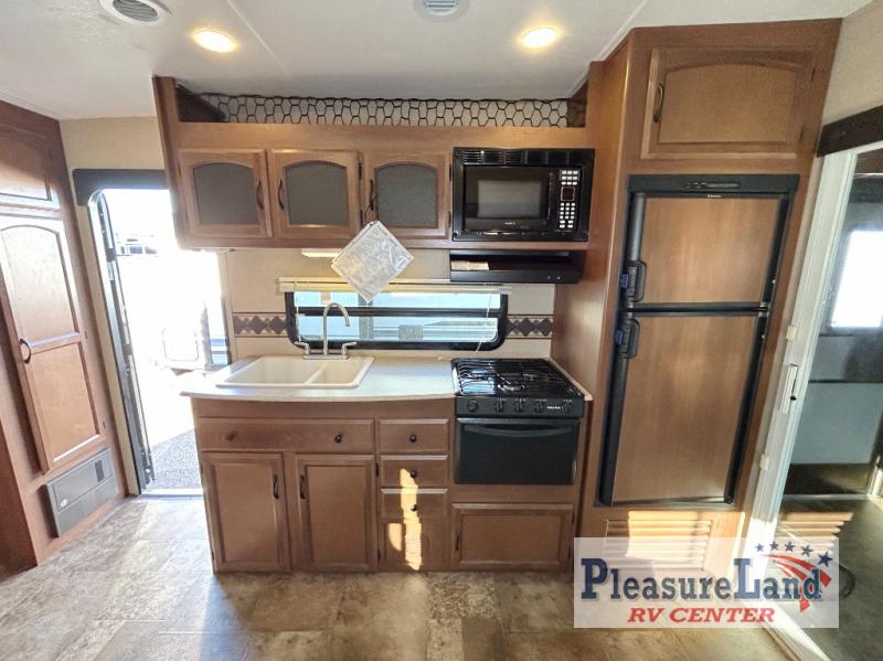 Step inside the main living area which features a large u-shaped dinette slide. Directly across the room is the complete kitchen featuring a refrigerator, three burner range with microwave, and double kitchen sink. There is also an entertainment center that can be viewed easily from the dinette.