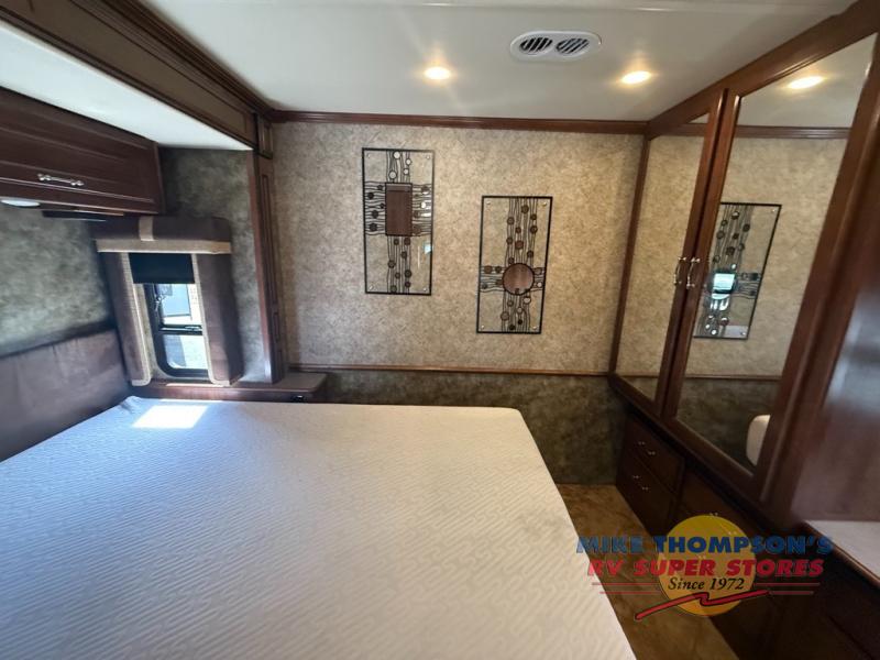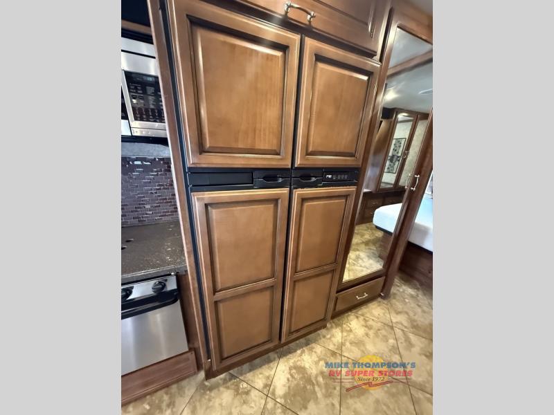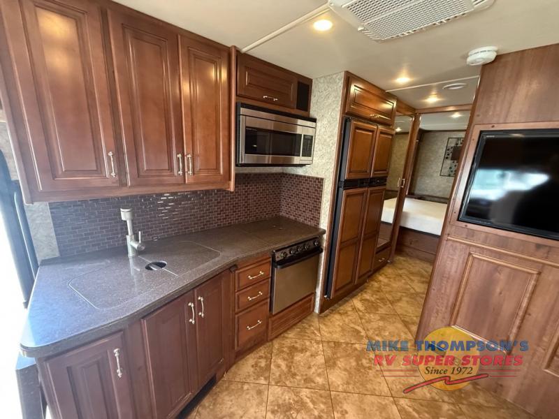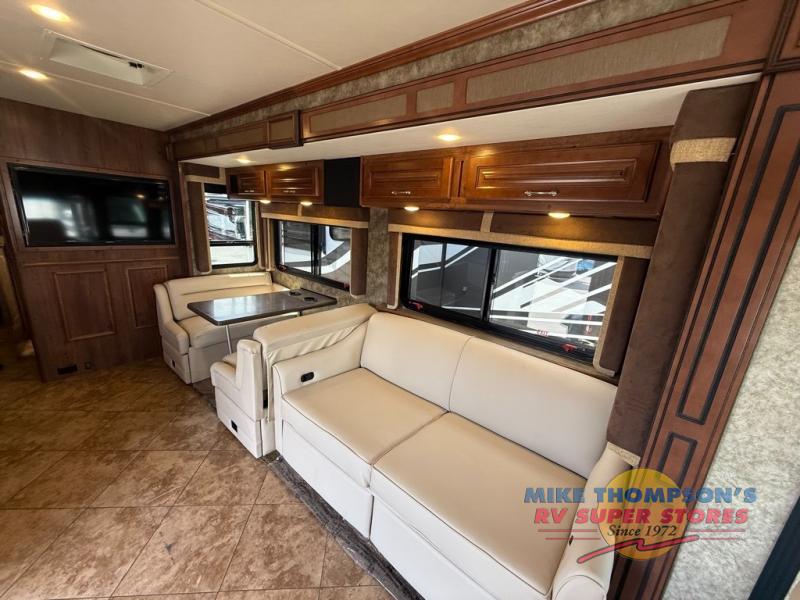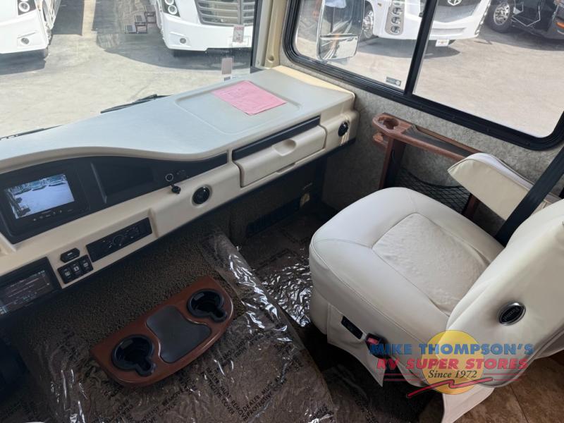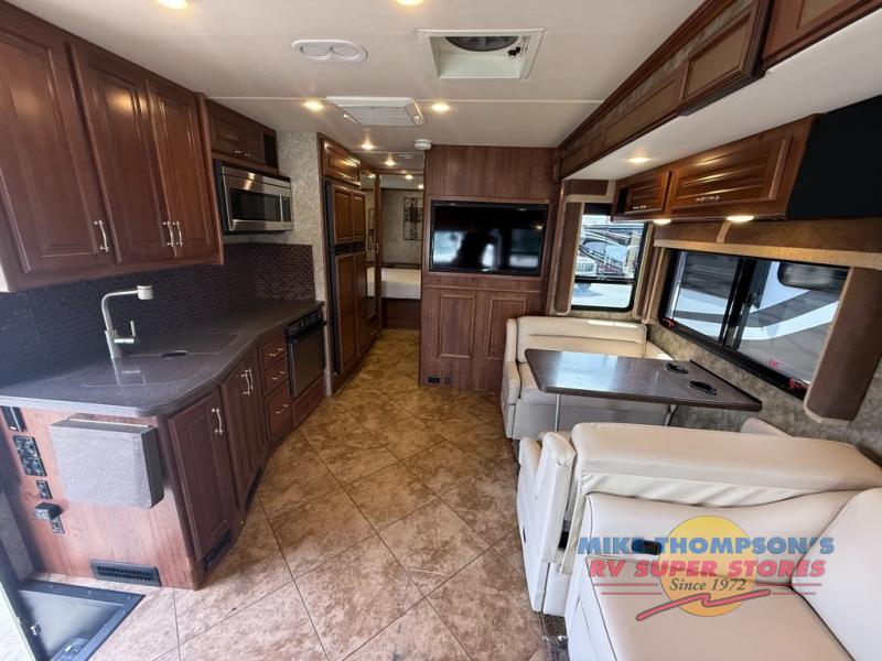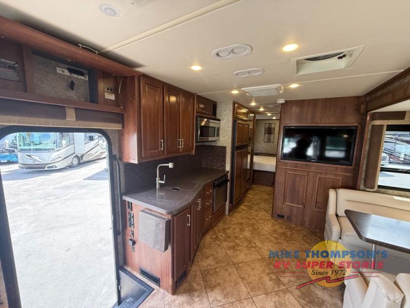 This motor home has plenty of overhead cabinet space for storage. There are also plenty of options to help tailor this motor home for your needs. You can choose a front 32" LED tv, 3 burner range with oven, sofa sleeper with air mattress & footrest, mid-ship 40" LED tv, free standing recliner, facing dinette, free-standing dinette with credenza, and a queen bed with air mattress.