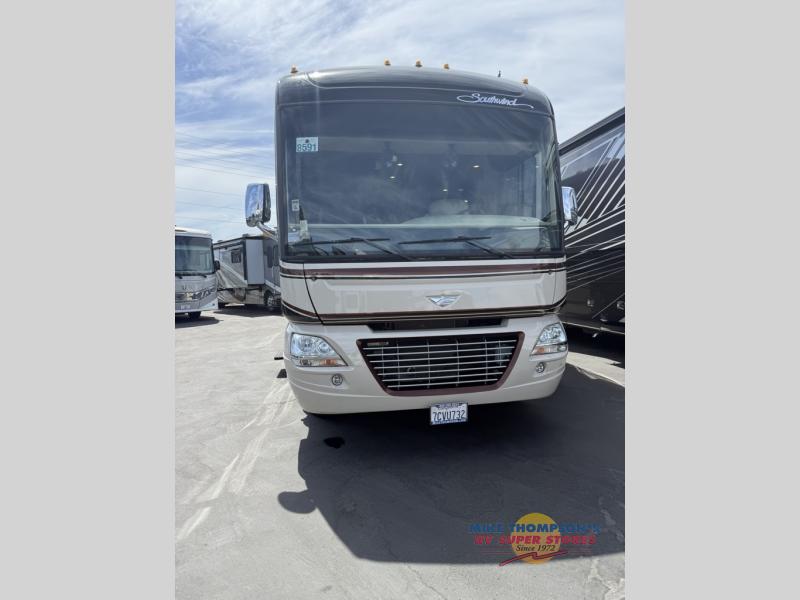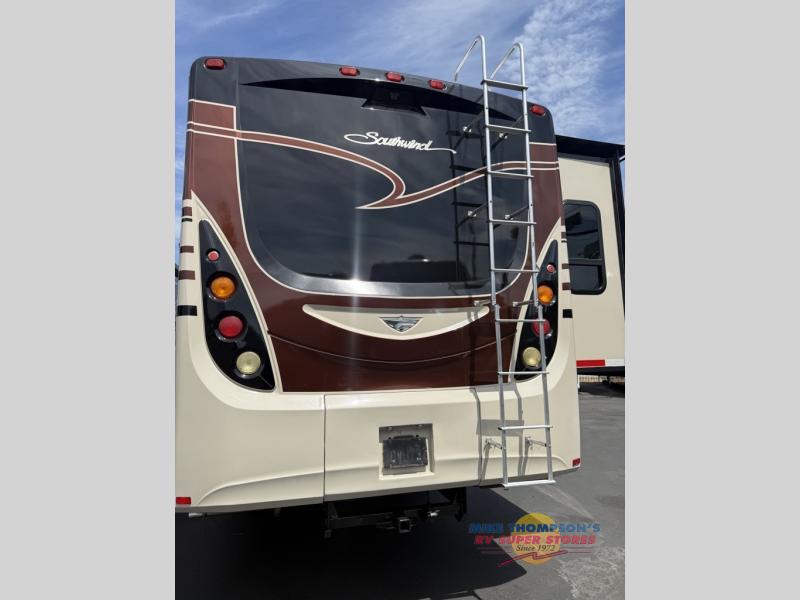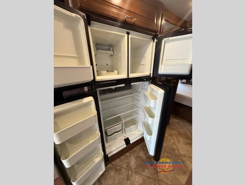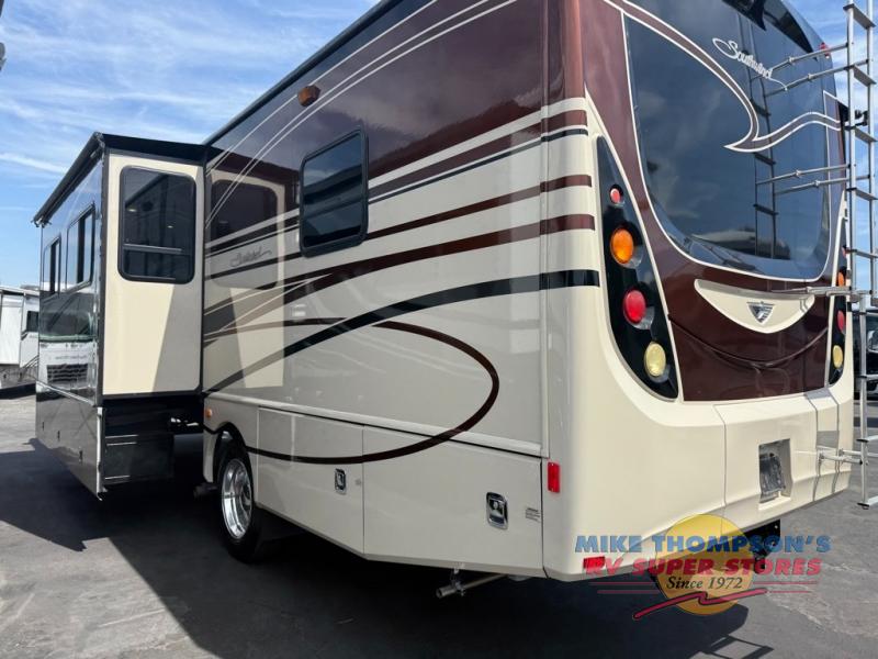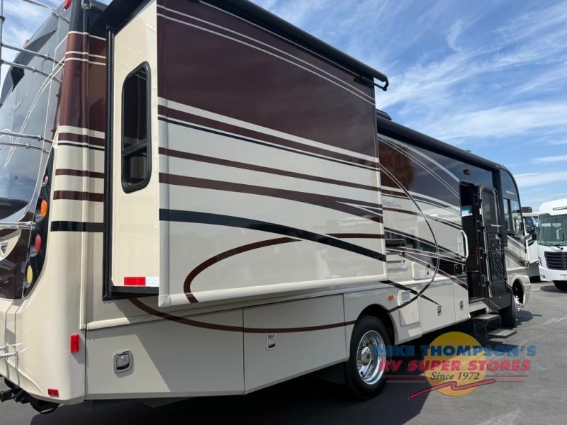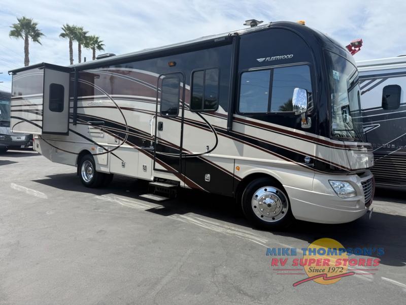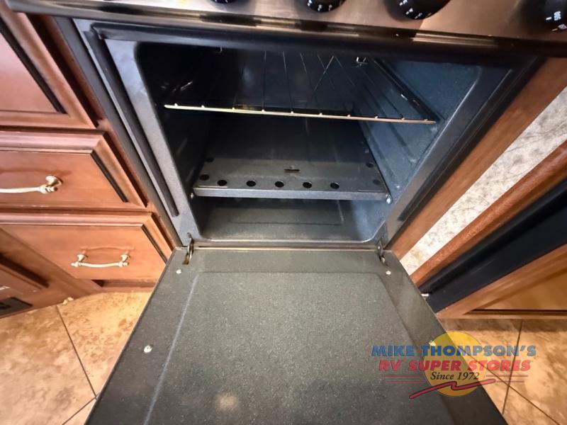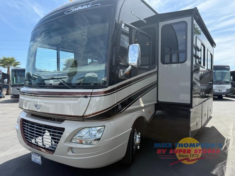 The 32VS Southwind motor home by Fleetwood is not lacking for space. Inside this model you will find an Euro chair with ottoman and end table on the right when you step inside. On the other side of the chair is a double kitchen sink, three burner range, microwave, and refrigerator. The opposite side of the motor home has a sofa sleeper and dinette slide.