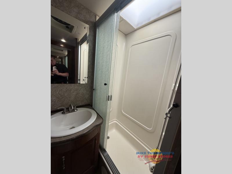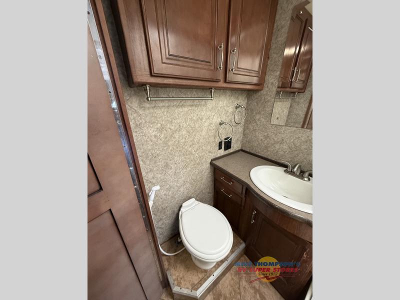 As you proceed down the hallway toward the rear of the motor home, the side aisle bathroom is on the right. Inside the bathroom you will find a shower, sink, and toilet.