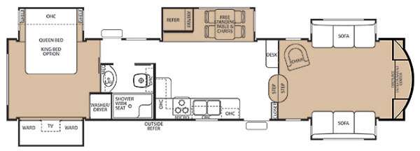 At the back of the Cedar Creek 38RL you will find a large, private master bedroom featuring a slide with queen bed with shelves on either side. A king bed is optional. Opposite the foot of the bed is another slide out housing a double wardrobe with a TV mount area. There is also a closet to house your washer and dryer.