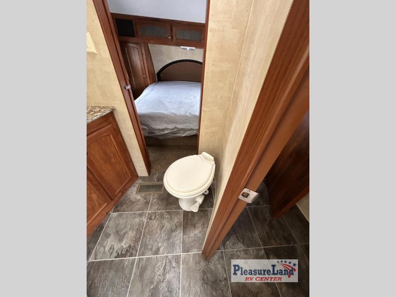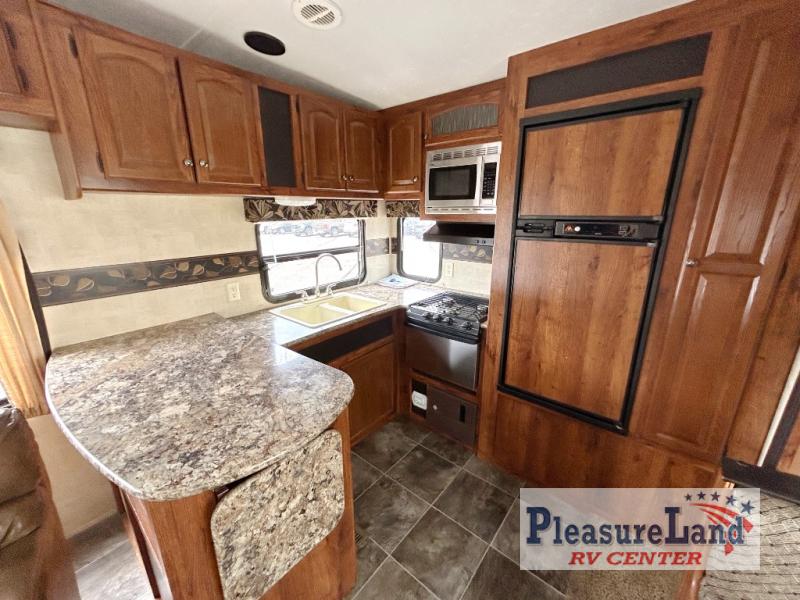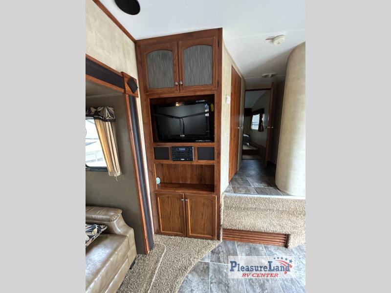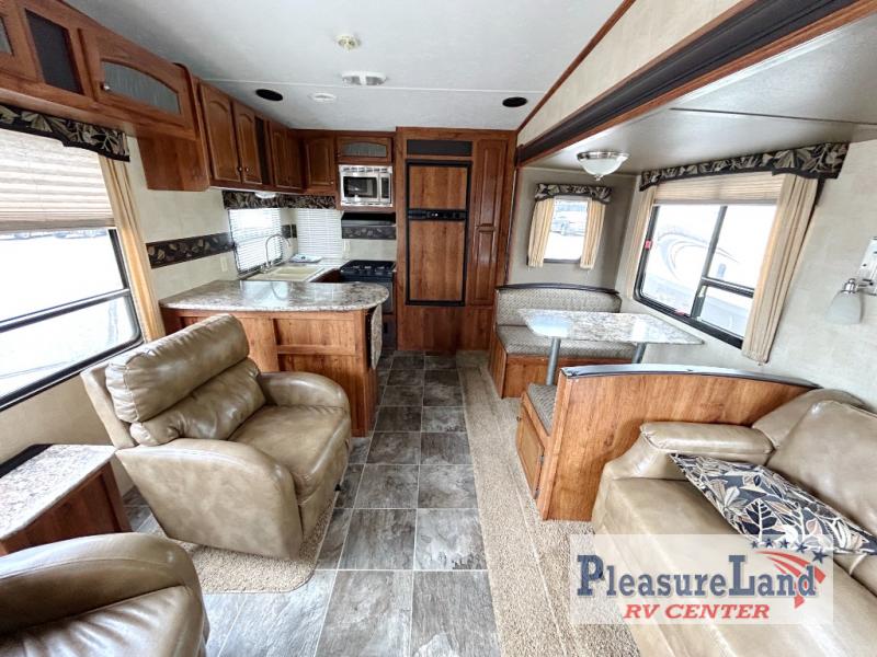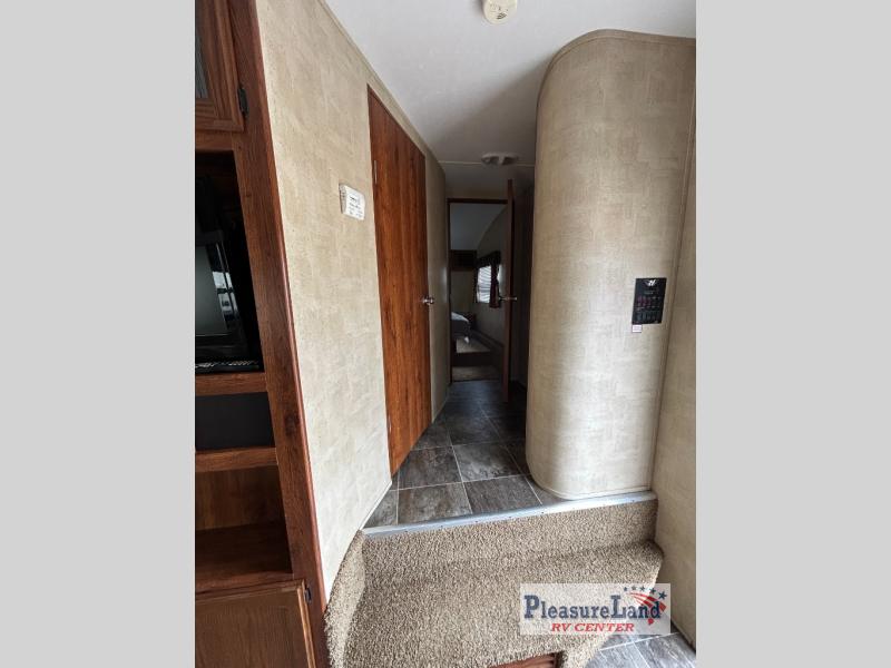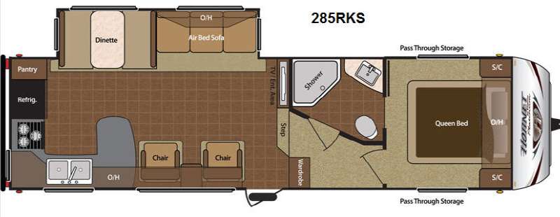 Keystone Hornet Platinum FW w/Rear Kitchen Including: Pantry, Refrigerator, 3 Burner Range, L-Counter w/Dbl. Kitchen Sink and Overhead Cabinets, Booth Dinette & Air Bed Sofa Slideout w/Overhead Cabinets Above Sofa, TV/Ent. Area, 2 Lounge Chairs w/Table Between & Overhead Cabinet, Step Up to Side Aisle Bath w/Angle Shower, Toilet & Sink, Wardrobe in Hall, Front Queen Bed w/Shirt Closets Both Sides of Bed, Front Pass-Thru Storage and Much More!