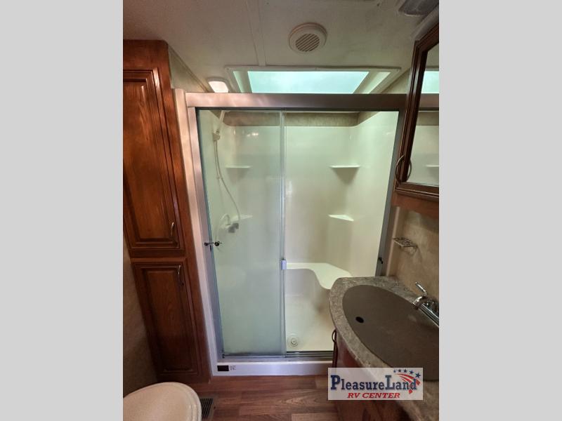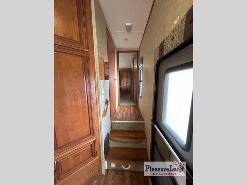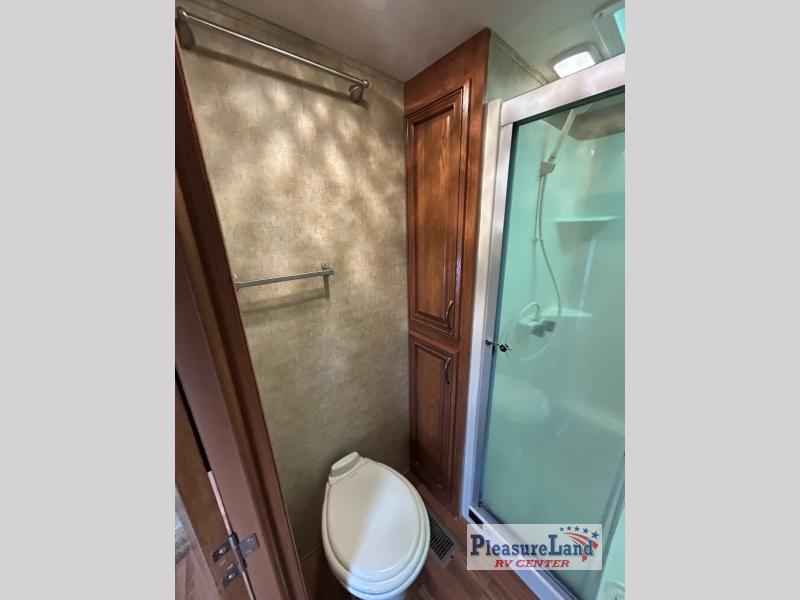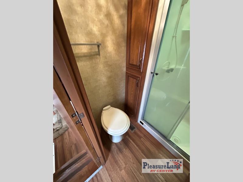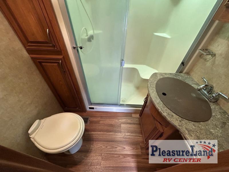 Head up the steps in front to a side aisle bath and bedroom. The bath offers a 48" x 30" walk-in shower with dome, a wardrobe, toilet, and vanity with sink, plus overhead storage.