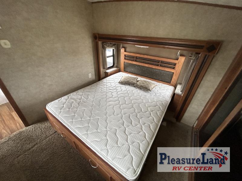 Continue down the hall to the front private bedroom that features a residential queen size bed, nightstands, a dresser opposite the bed, and front wardrobe with corner space that has been prepped for a washer and dryer, plus so much more!
