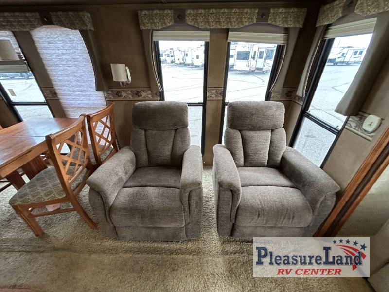 Enter this rear living unit and find a dining table for four, plus two lounge chairs to the left of the entry door. Along the rear wall there is a sofa with overhead cabinets and two end tables. The kitchen slide opposite the door also features an entertainment center with overhead storage.