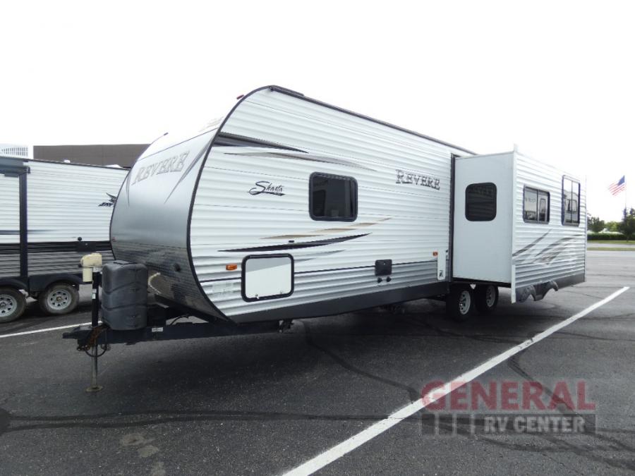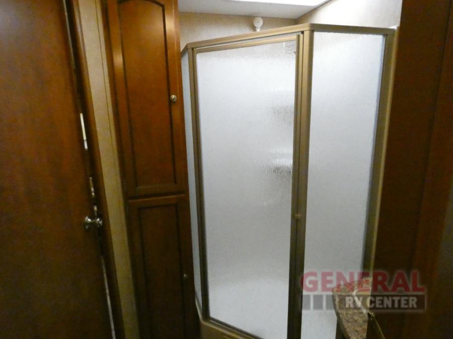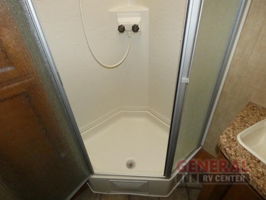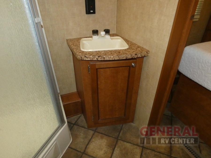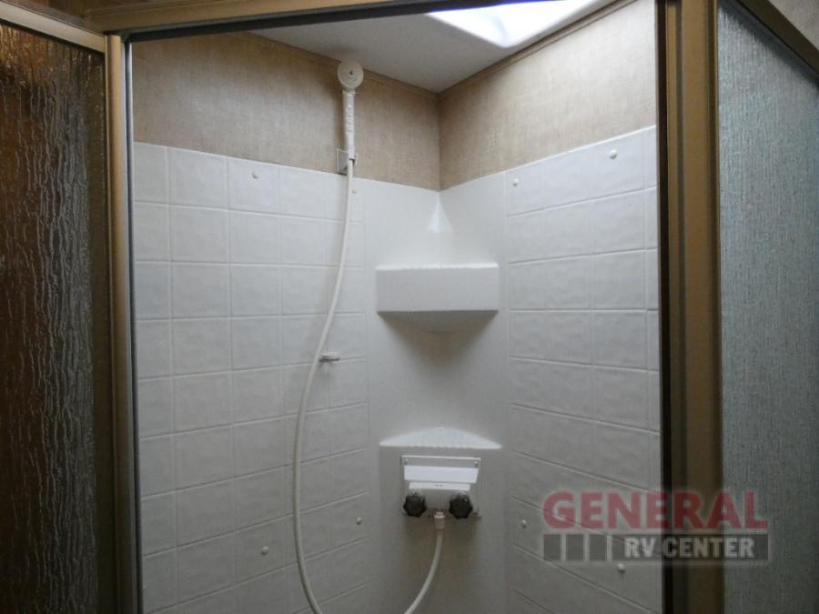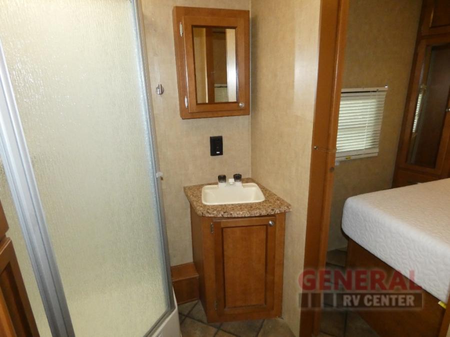 As you enter the Revere 29RK travel trailer from Shasta, a full bath is to your right across the hall. It includes a closet, a corner shower, a vanity sink, a medicine cabinet, a toilet and a door to the bedroom.