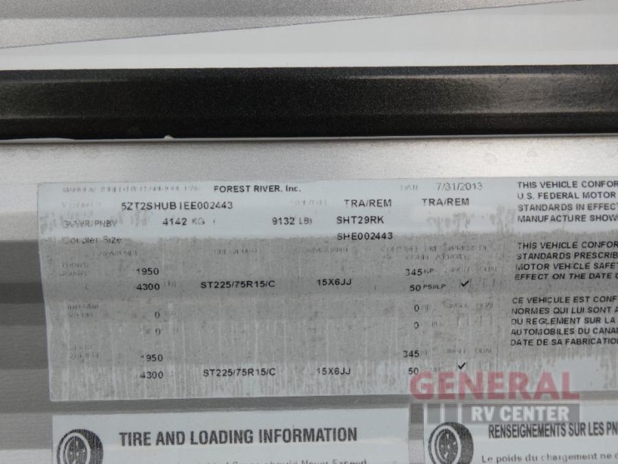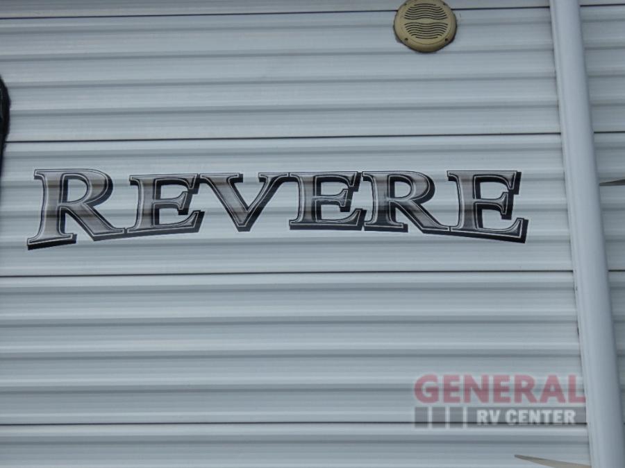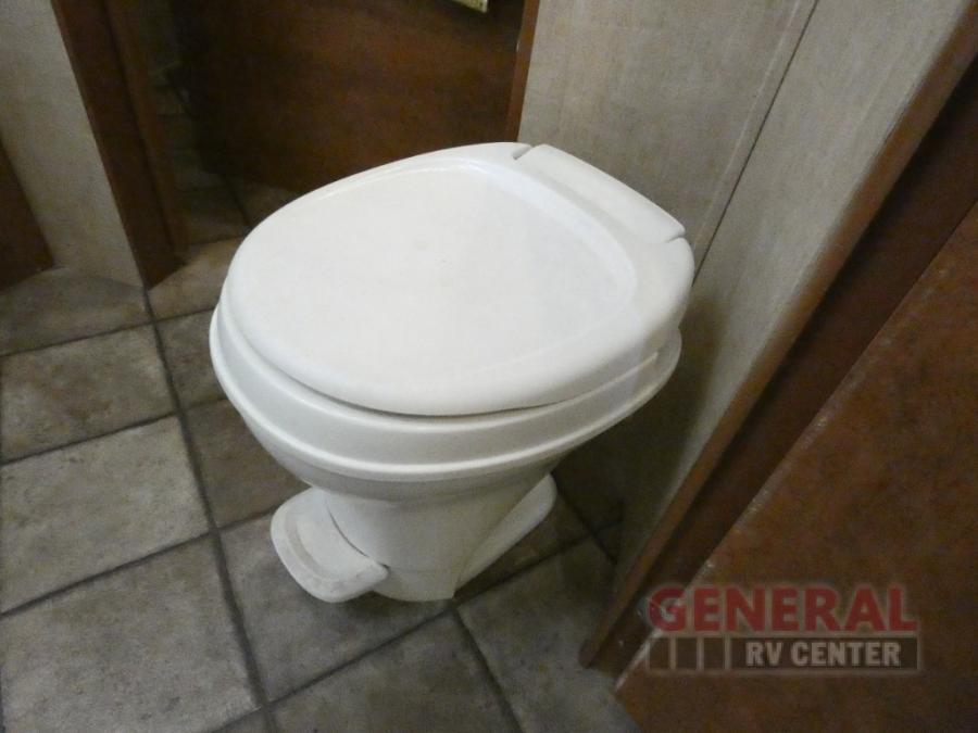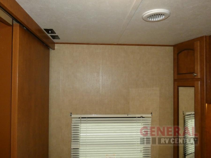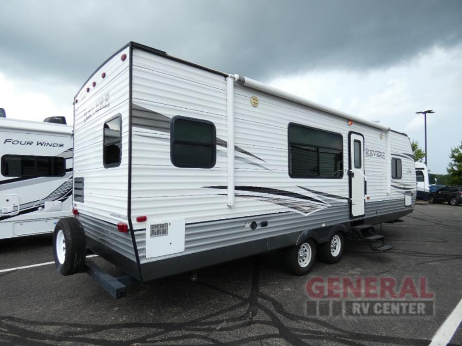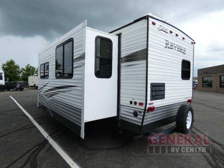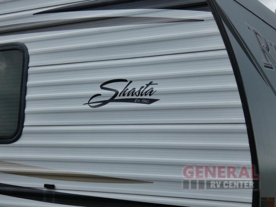 As you enter the Revere 29RK travel trailer from Shasta, a full bath is to your right across the hall. It includes a closet, a corner shower, a vanity sink, a medicine cabinet, a toilet and a door to the bedroom.
