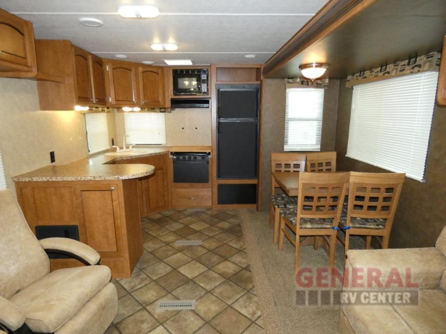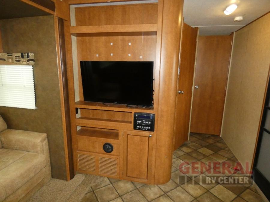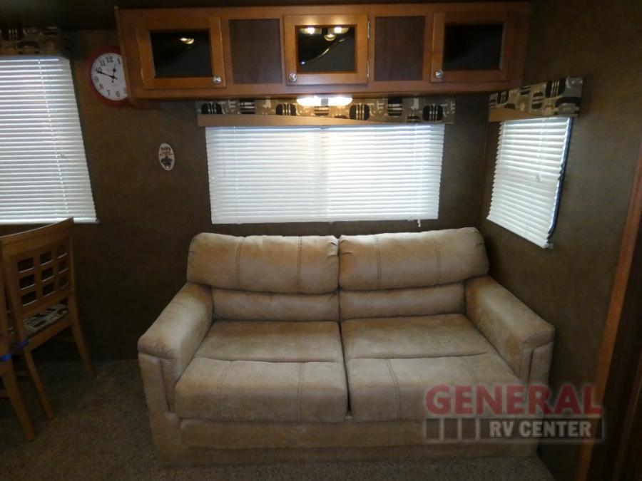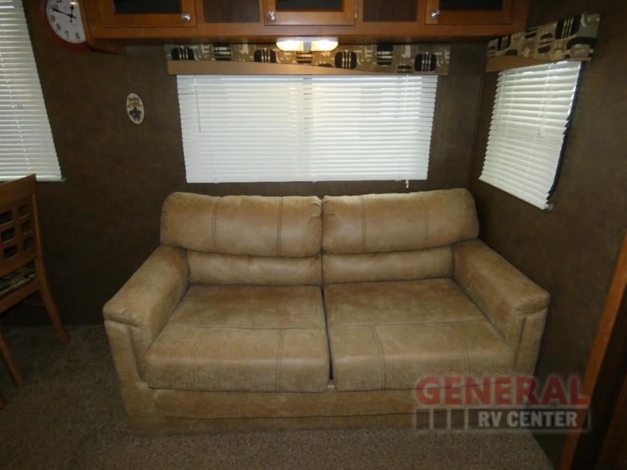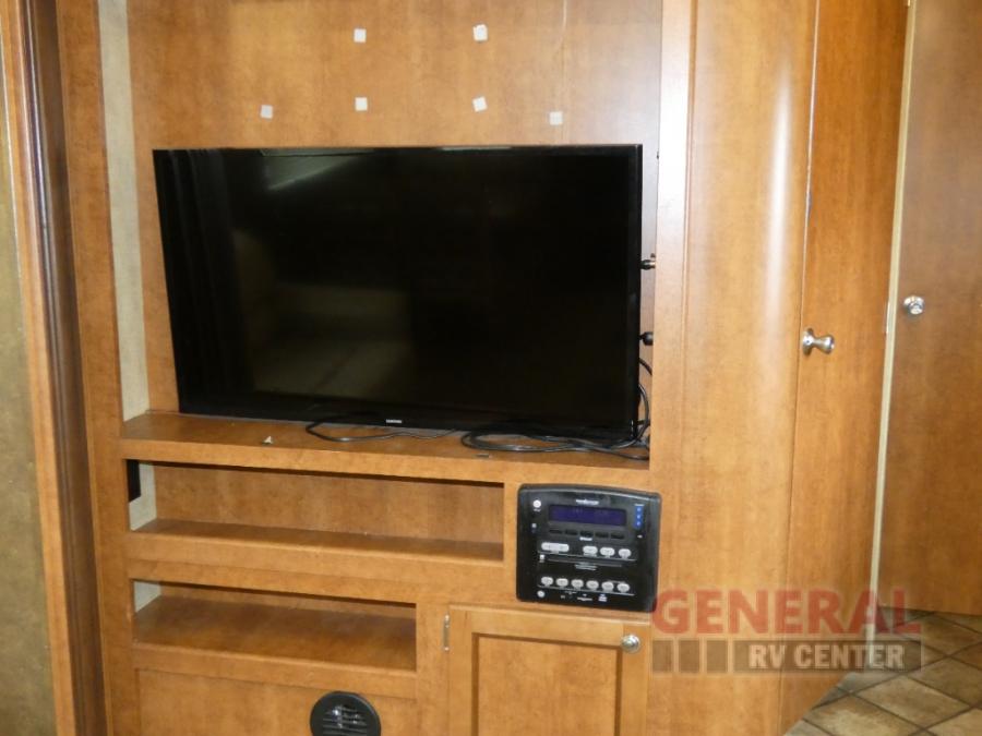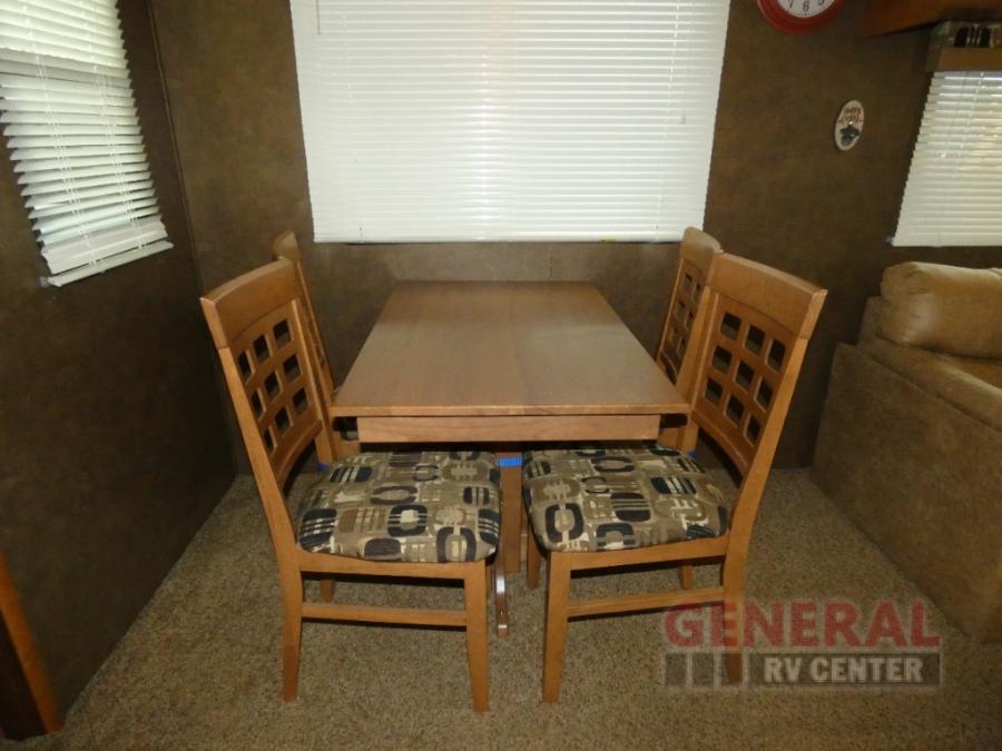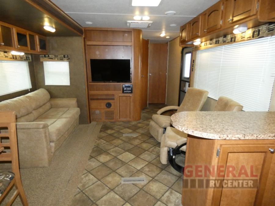 In the combined living/dining/kitchen area, there is an entertainment center on the front wall. A generous slide along the road side provides a sofa with overhead cabinets and a free standing table and chairs.