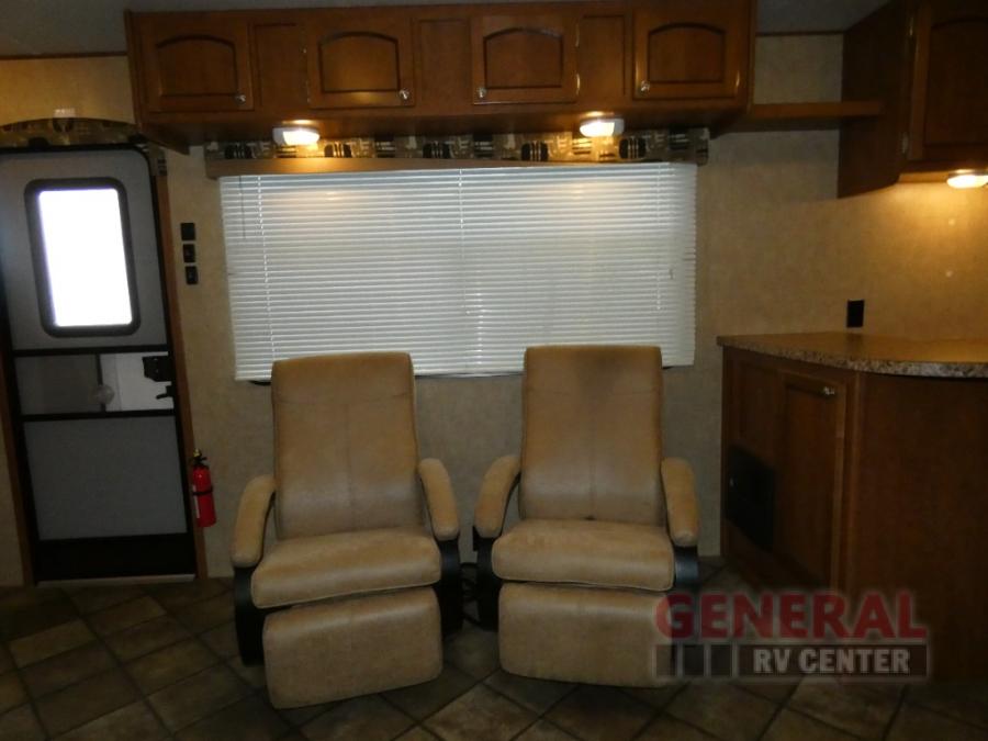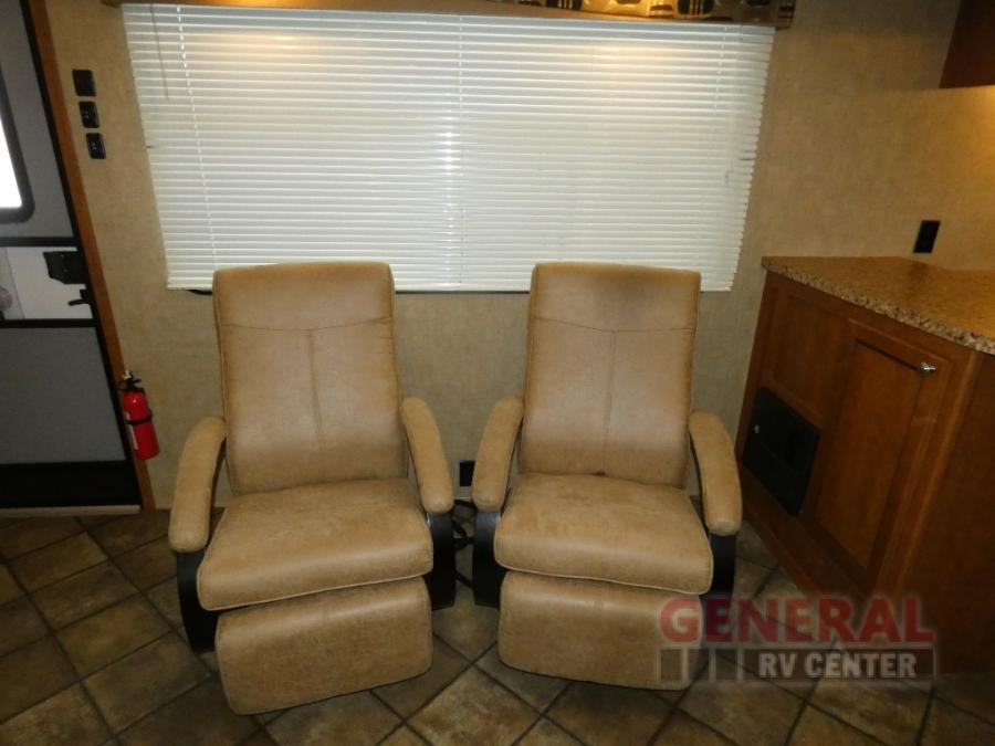 Just beyond the kitchen counter you will find two lounge chairs with more overhead cabinets.
