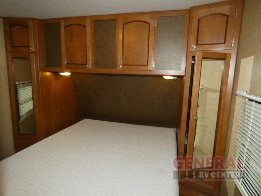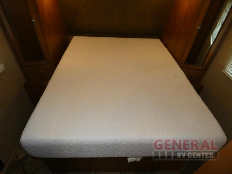 The front private bedroom includes a walk around queen bed, a wardrobe at each side and overhead cabinets.