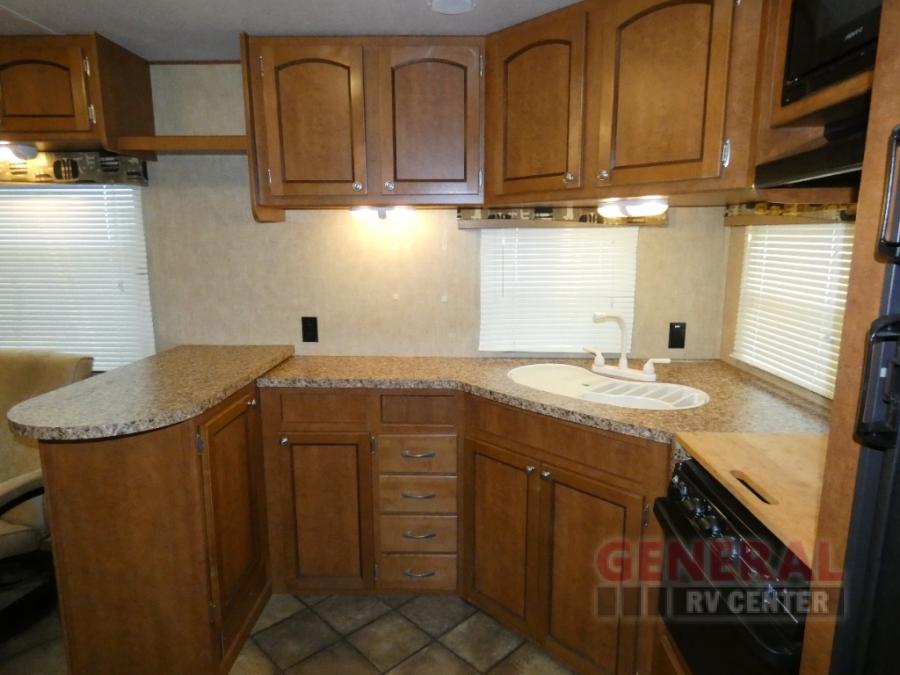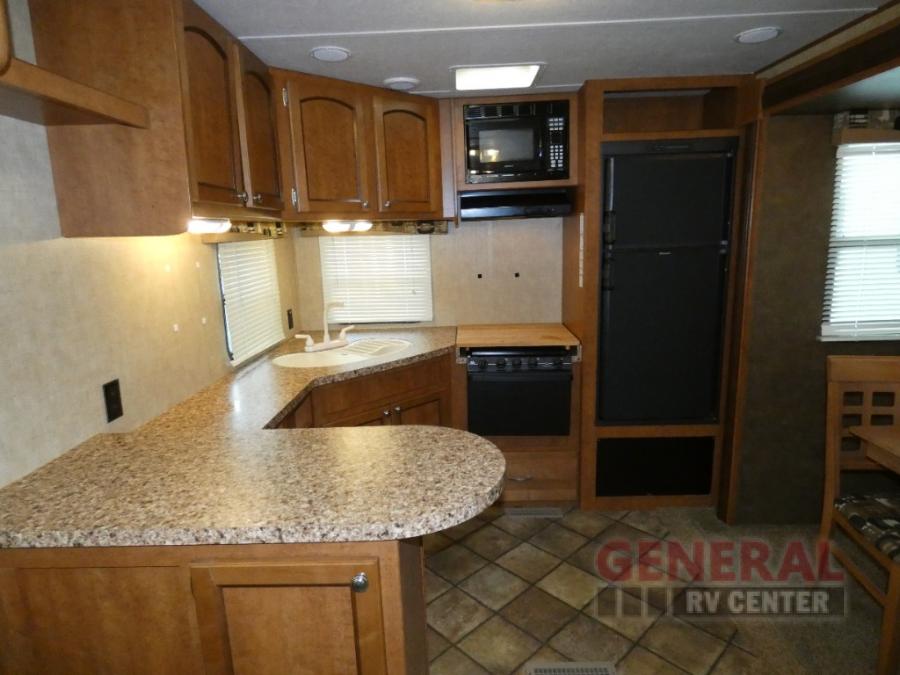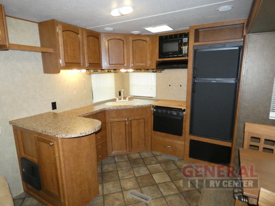 The kitchen runs along the rear wall and onto the curb side. It includes a refrigerator, a three burner range, overhead cabinets including in the corner, a corner angled large sink, and lots of counter space including a section that extends in toward the center of the travel trailer.
