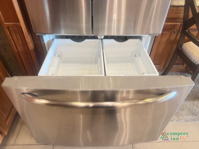 Inside, the 40 QTH floorplan offers four spacious slide-outs that create an open, residential-style living space. The living area features ultra-comfortable seating, premium cabinetry, and elegant finishes, giving you the feeling of a luxury condo on wheels. A fully equipped kitchen with solid-surface countertops, residential refrigerator, convection microwave, and abundant storage ensures you can prepare meals with ease while on the road.