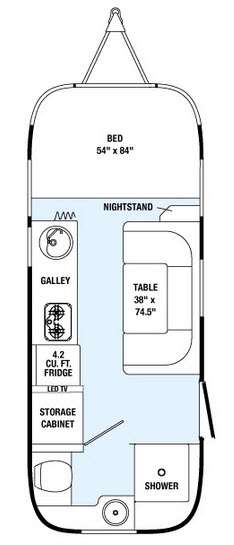 Step inside and you’ll immediately notice the bright, open layout that makes smart use of every inch. The rear bath features a full shower, sink, and toilet, providing the convenience of home wherever you go. Up front, the cozy bedroom includes a comfortable bed and nightstand, offering a restful retreat after a day of adventure.