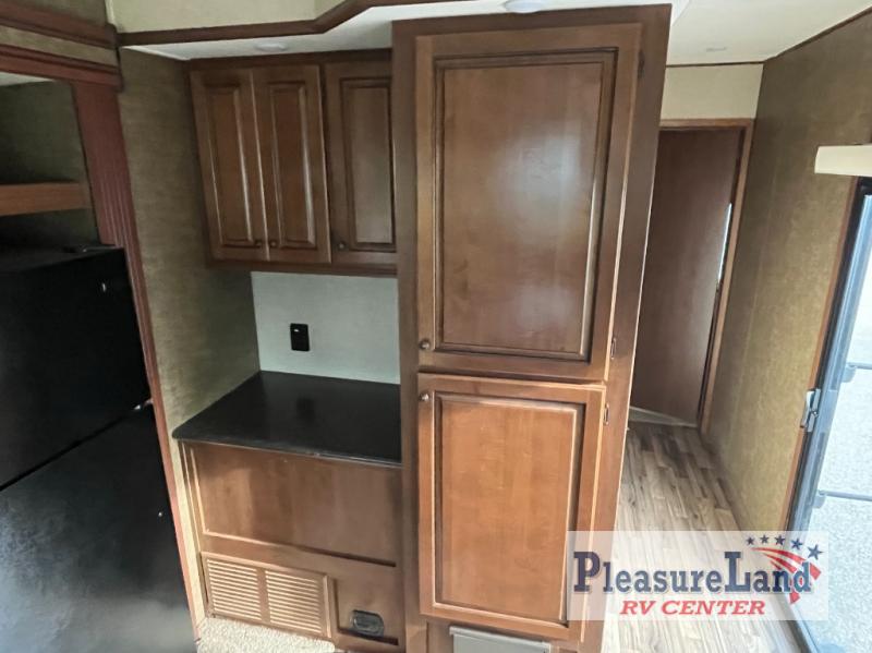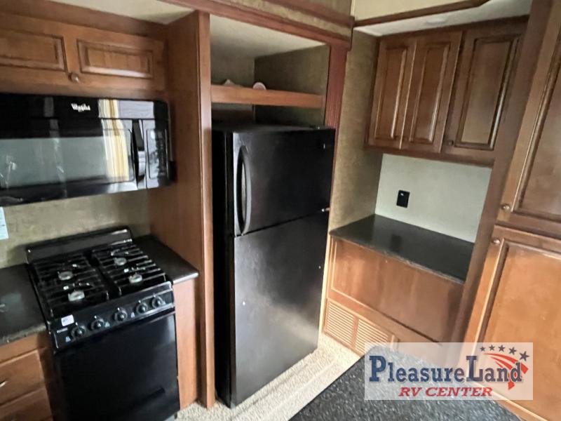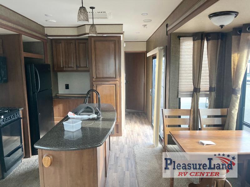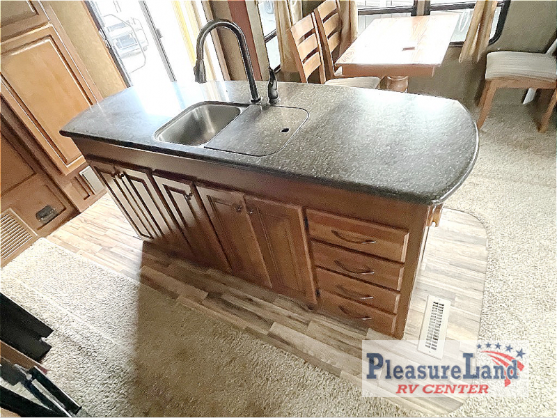 Step through the sliding patio door to a beautiful open kitchen with a pantry, counter and overhead cabinets along an interior wall. A slide out has a refrigerator, four burner range, lots of counter space and overhead cabinets. There are also two recliners in the slide. A large kitchen island holds a double sink.