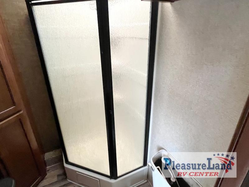 Moving toward the front, a side aisle bathroom includes a large vanity with sink, linen storage, corner shower, and toilet.