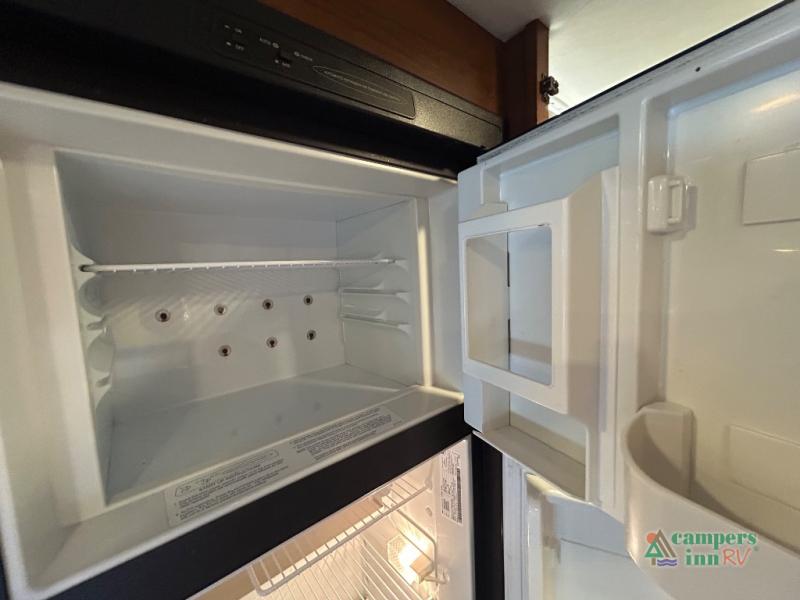 The kitchen area also provides a refrigerator to the left of the entry door, and straight across from that is a counter top with round sink and storage above, plus a little counter space for prep work and more.