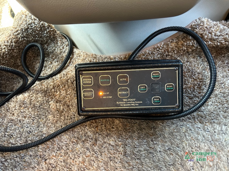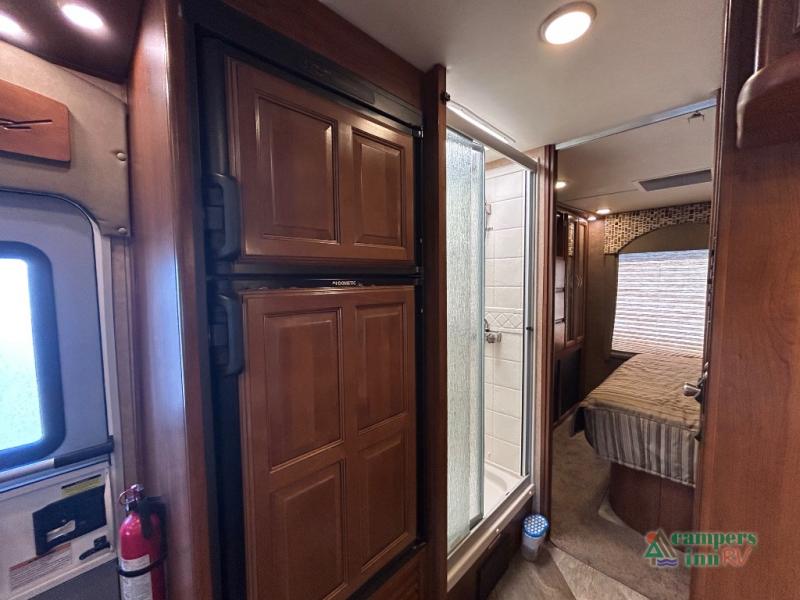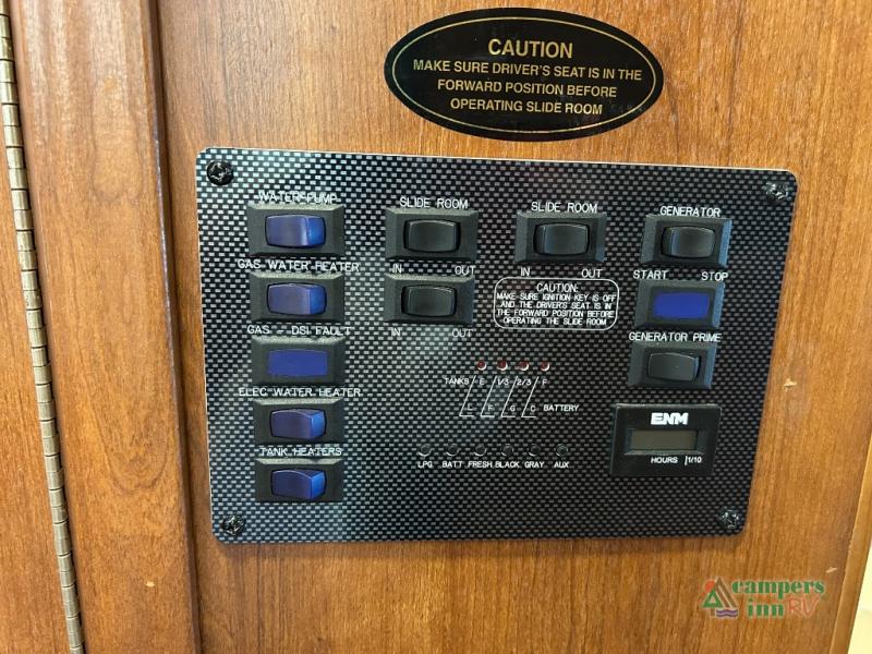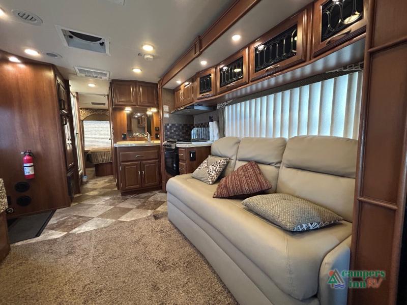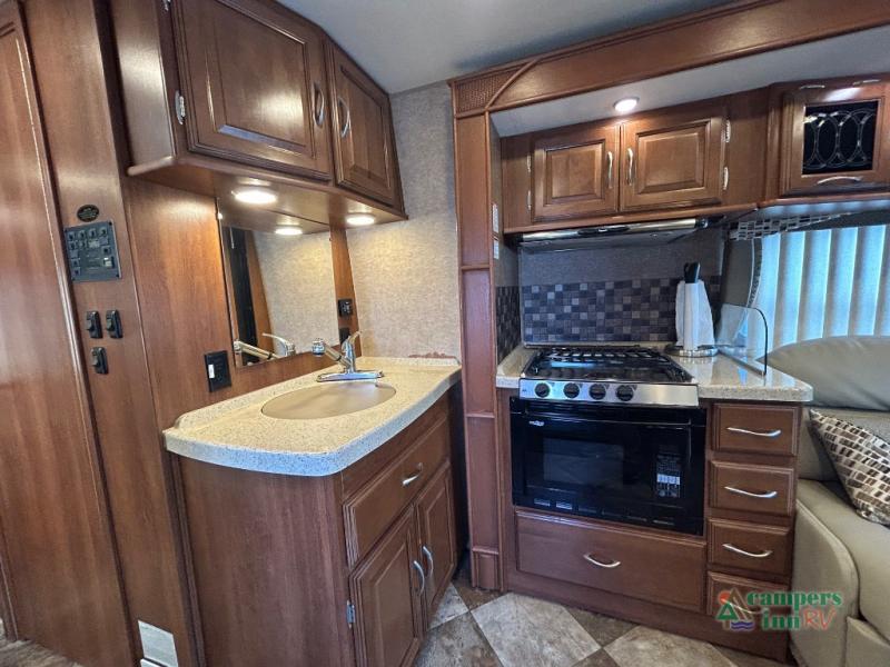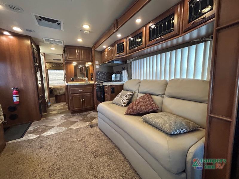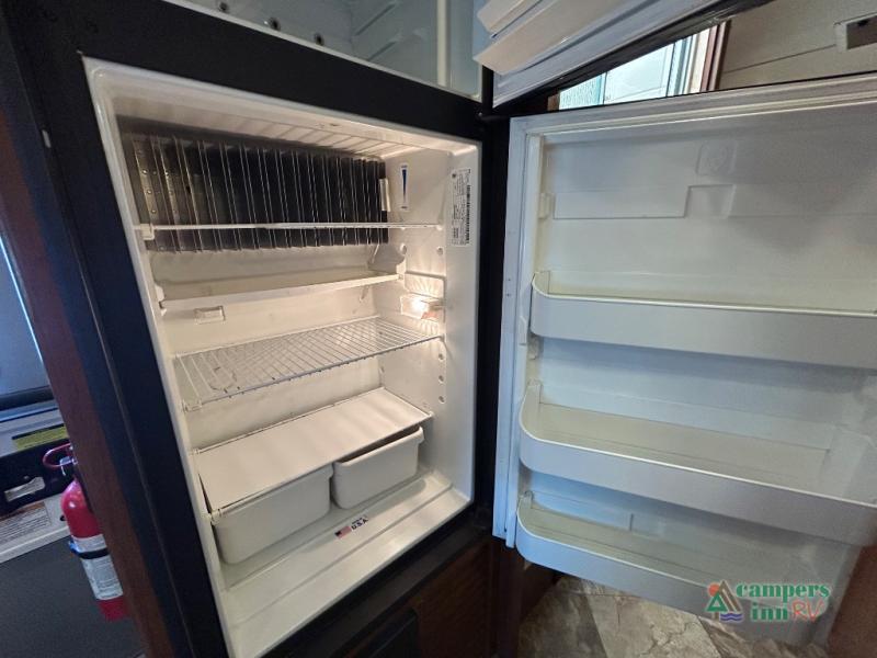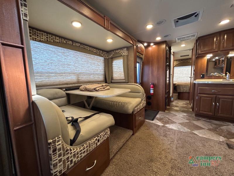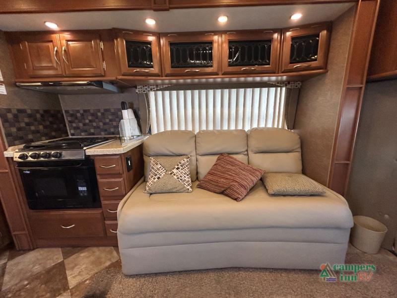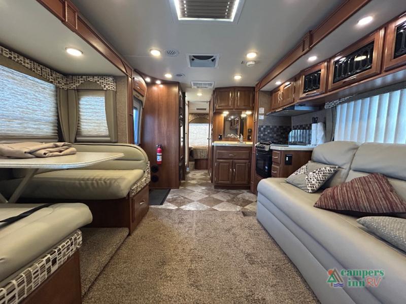 Step inside and find a wide open interior with dual opposing slides fully extended. There is a booth dinette slide to your immediate right as you enter. An entertainment center with 32" TV can be found above the cab area for your enjoyment, and a second slide out opposite the door features a comfortable sofa to relax on and enjoy along with a three burner range for cooking meals at.