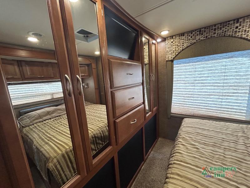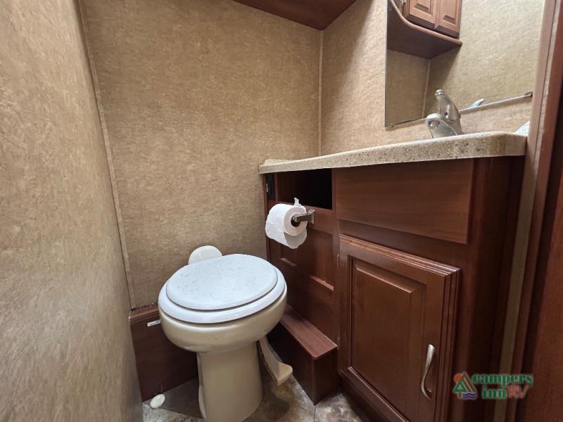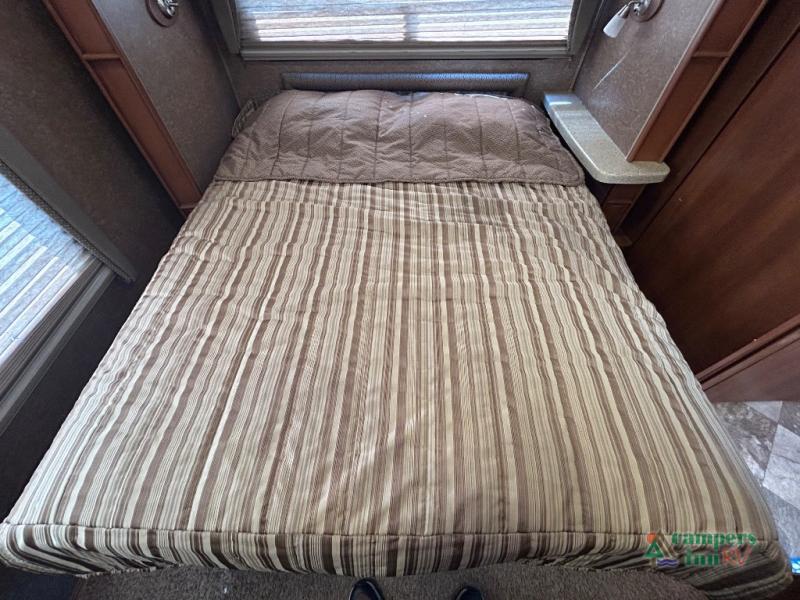 Head into the rear bedroom where you can rest up for another day of adventure easily. There is a queen size bed slide out with nightstand and storage on the side, along with overhead cabinets for your things. There is also a dresser opposite for clothing storage, and a space for an optional 24" TV if you choose to add.