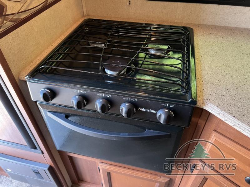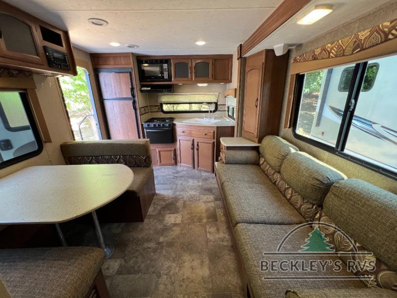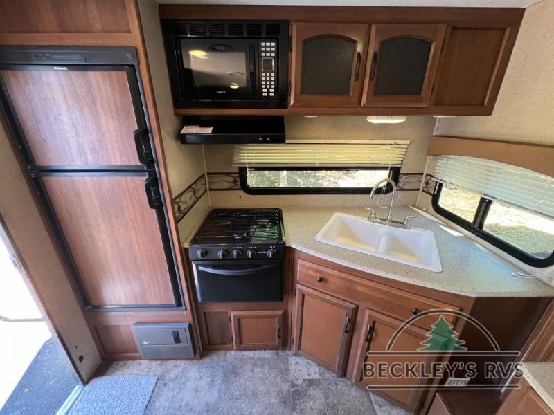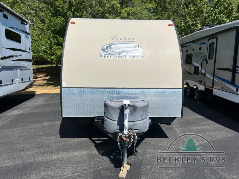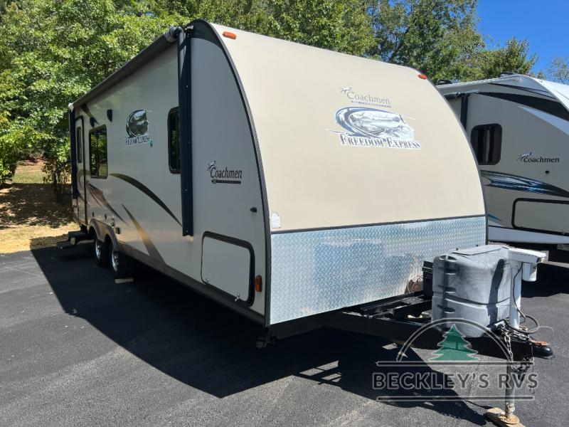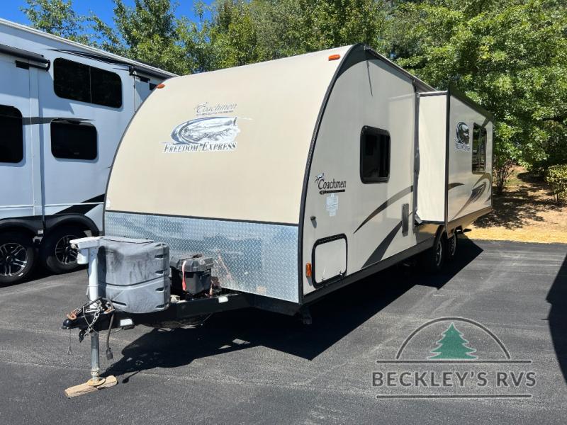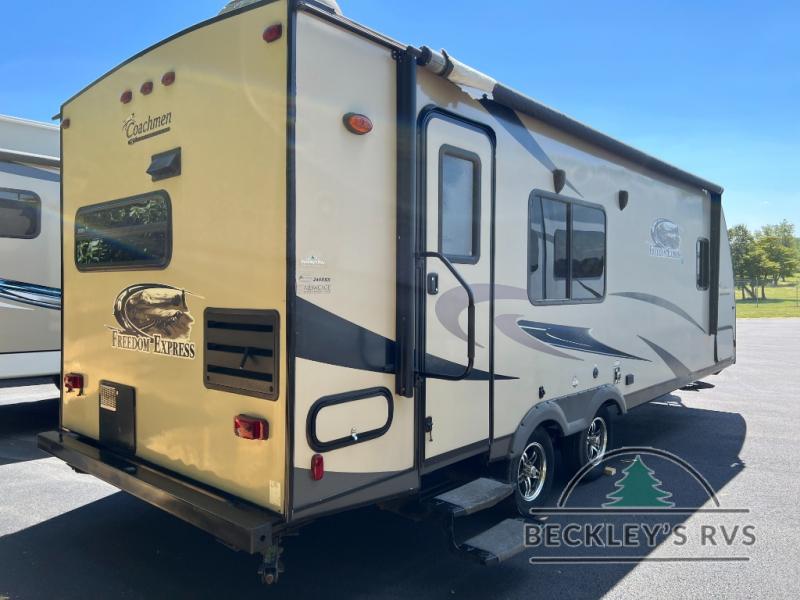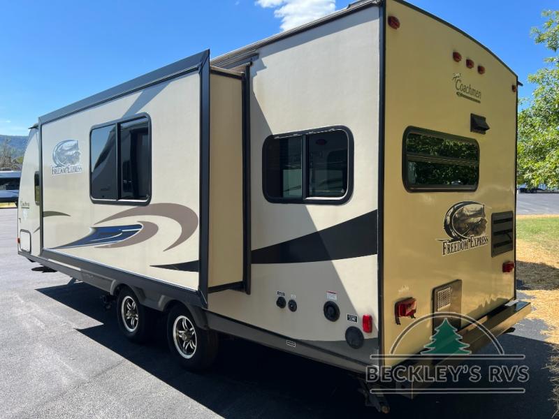 You will enjoy traveling in this 246RKS Freedom Express ultra lite travel trailer by Coachmen RV. The focus of this unit is the rear kitchen and large slide-out. As you step inside you are greeted with a complete kitchen set-up including a refrigerator, 3 burner range and microwave oven, plus a double sink and overhead storage cabinets.