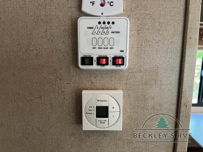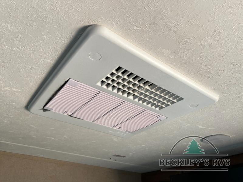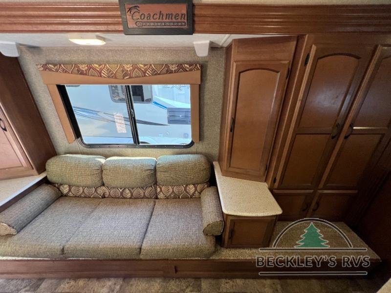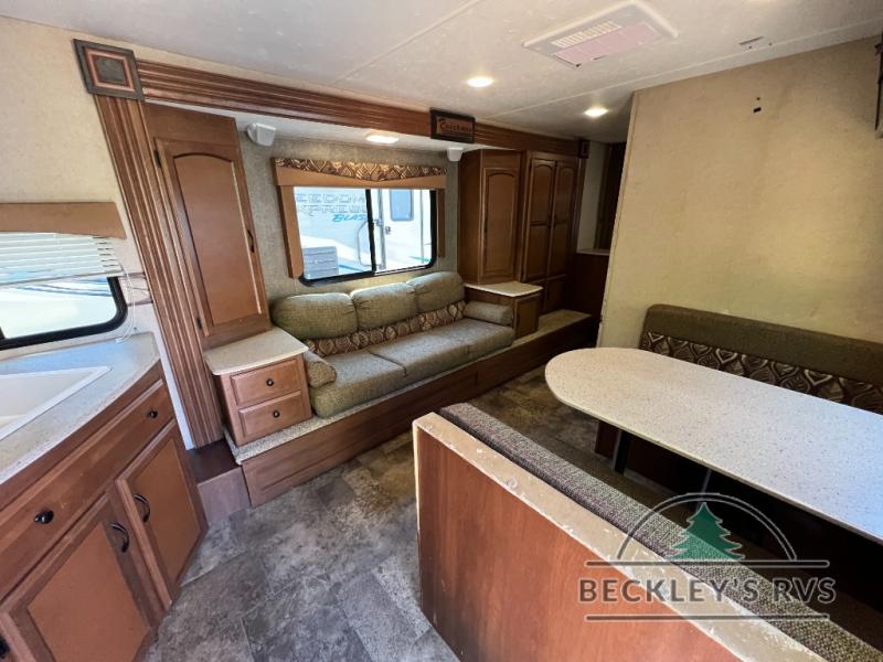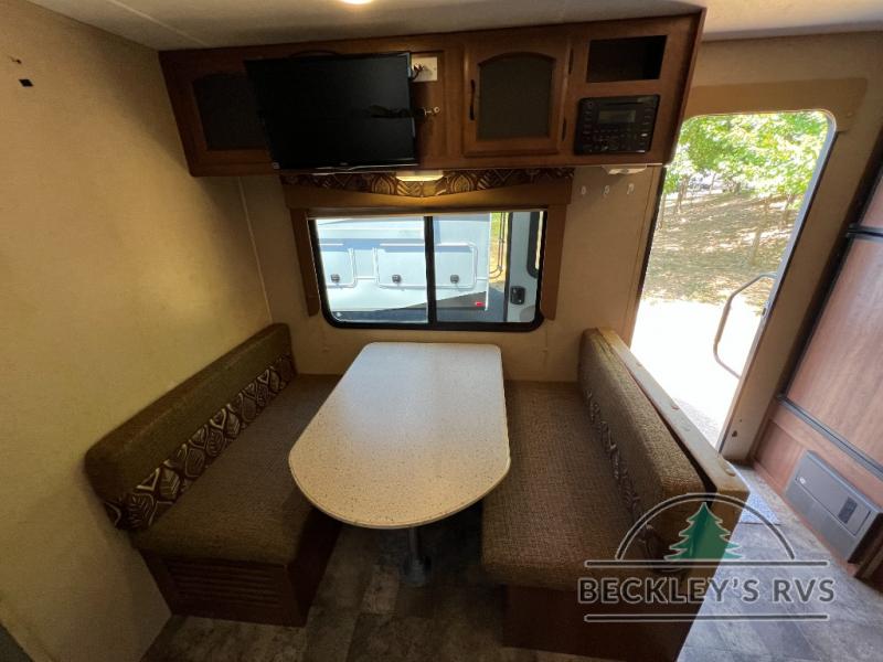 The large slide opens up the living space and features a comfortable sofa with two end tables and also a wardrobe with bench seat. Opposite the slide is a booth dinette that also has overhead storage cabinets above.