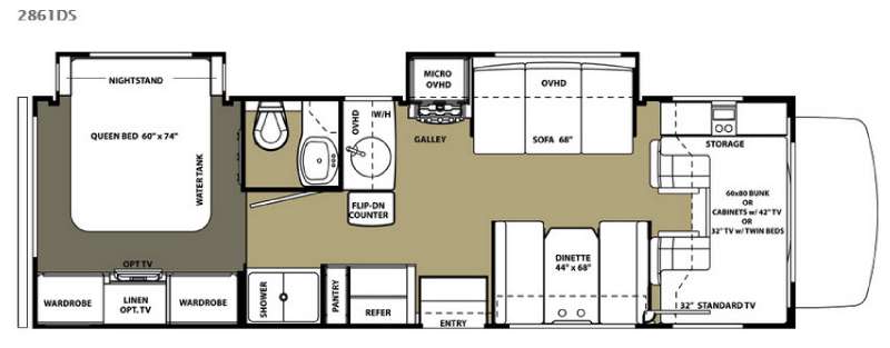 Continuing around from the shower, there is a pantry and a refrigerator. Past the entry door, there is a 44" x 68" dinette. The front of the cab features an overhead bunk that is 60" x 80" or you can choose optional cabinets with 42" TV or optional 32" TV with twin beds.