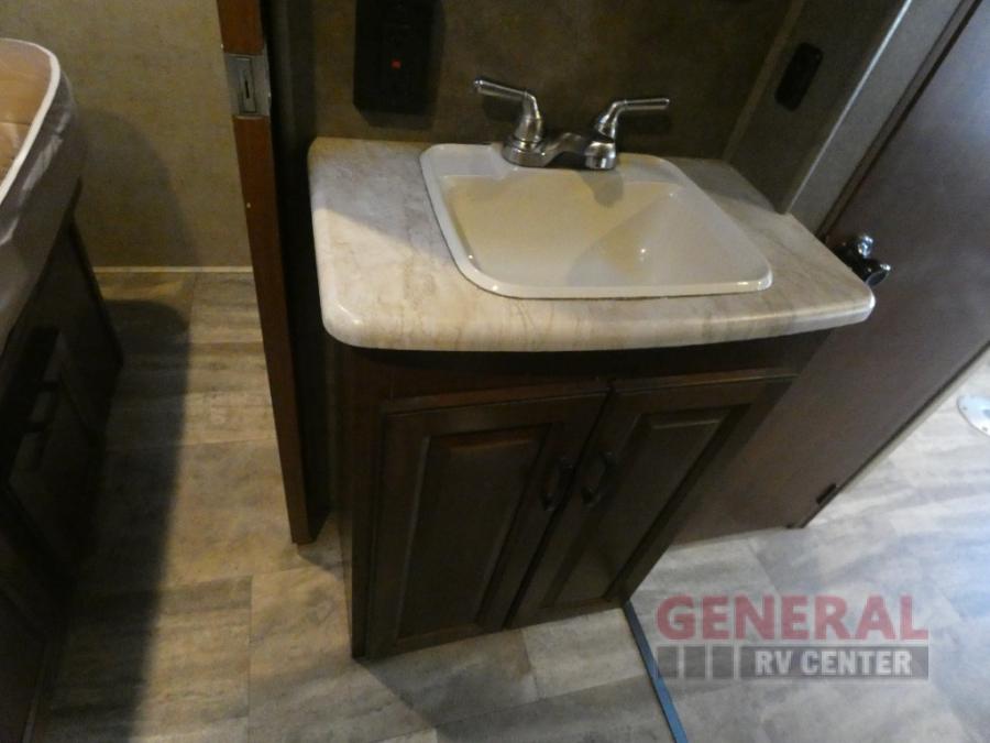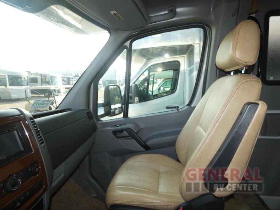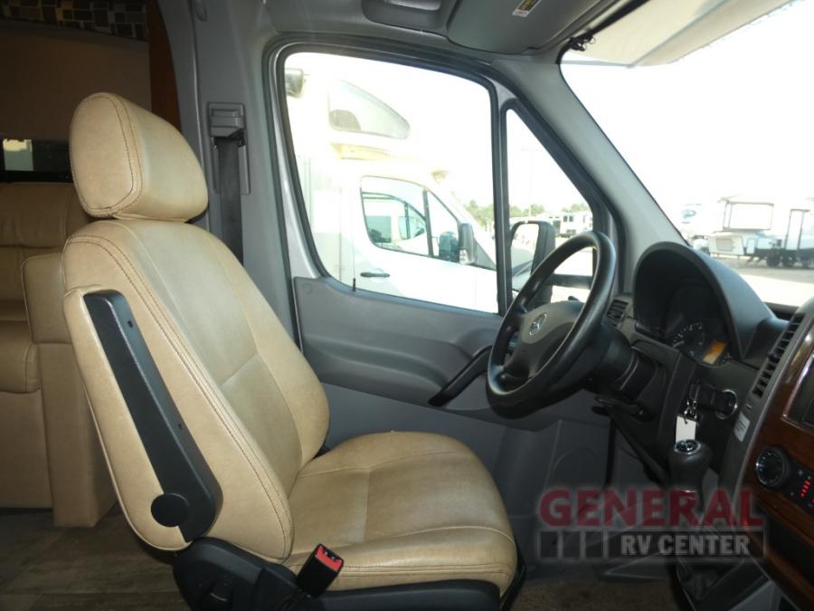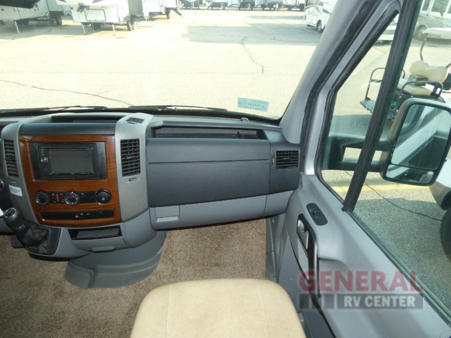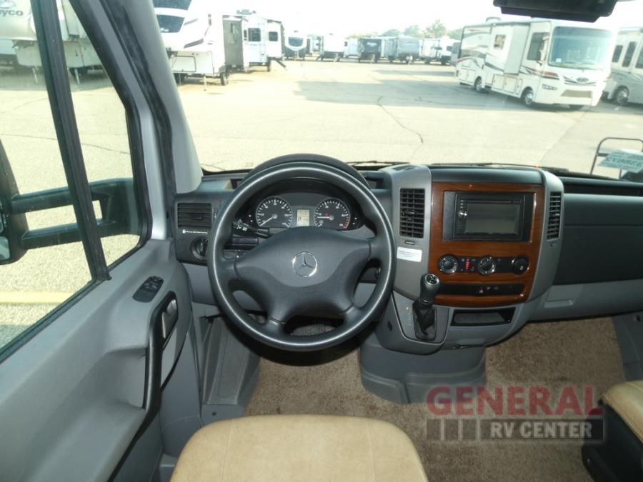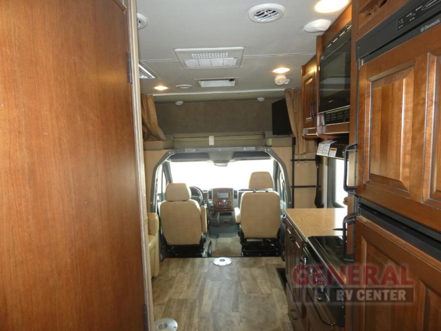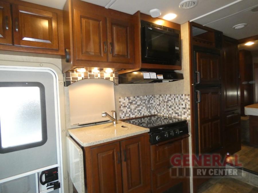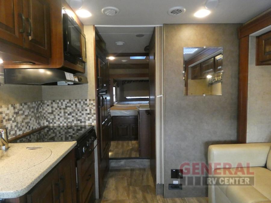 One side of the motor home has a flip-on counter, single sink, three burner range, and refrigerator. The other side has a seating/dining area.