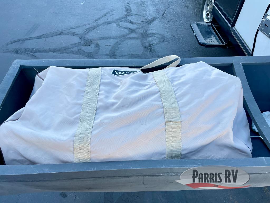 Outside this folding pop-up camper is sliding storage for easy access, an awning and a RVQue gas grill.